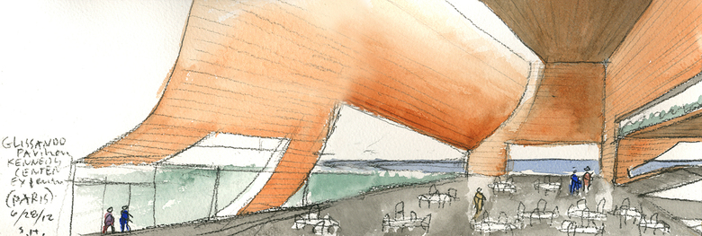 While all different in form, resisting any defined geometric description, the three pavilions are connected through their ruled-surface geometry. This strategy creates a language of forms, from conical sections to hyperbolic paraboloids, a visual acoustics echoing across the pavilions, cupping space between them, and dispersing sound on the inside.