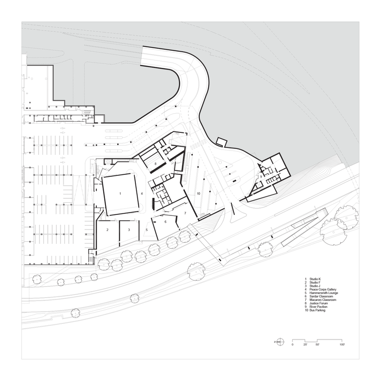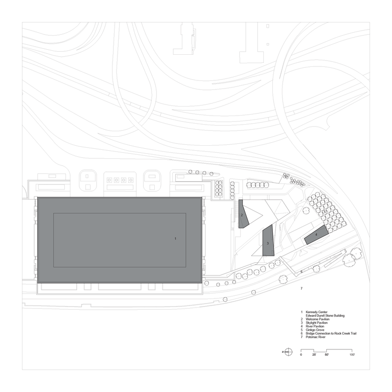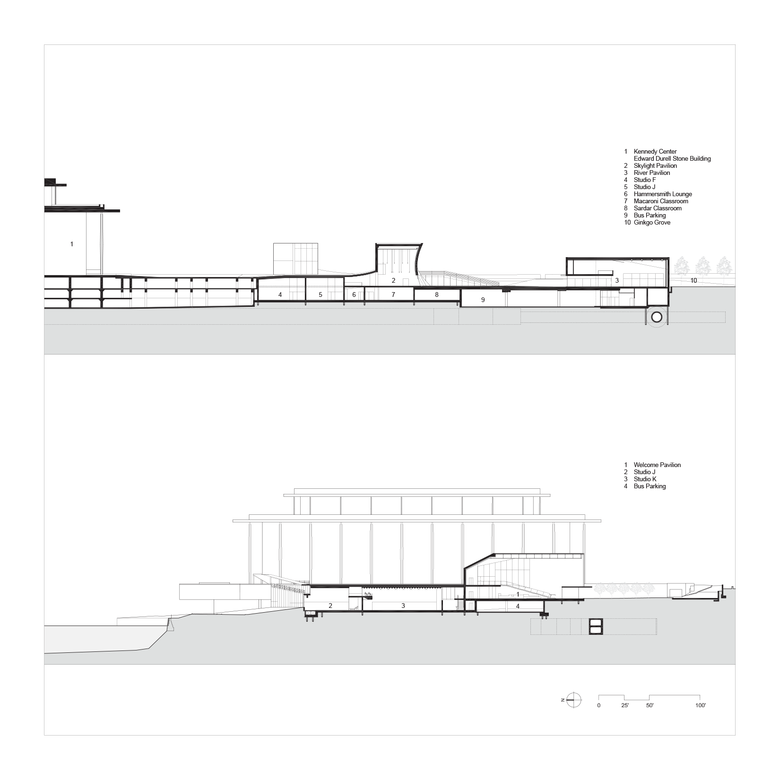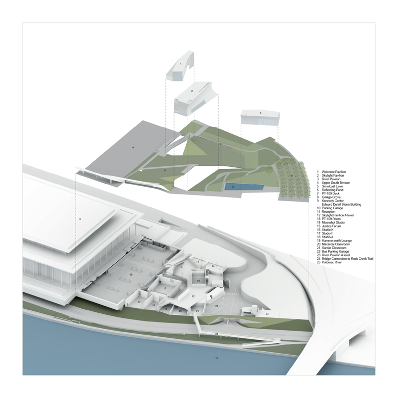 In complementary/contrast to the monumental original Kennedy Center building by Edward Durell Stone, The REACH’s three pavilions are fused with the landscape. They shape outdoor spaces between them, and frame views to the Washington Monument, Lincoln Memorial and Potomac riverfront. The three pavilions are interconnected below green roofs to expand the Kennedy Center’s interior space with 72,000 sf of open studios, rehearsal and performance spaces, and dedicated arts learning spaces. Embedding much of the expansion under a public landscape offers maximum green space to the community and gives landscape views from the interior spaces.