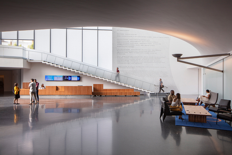 Natural light is given to all spaces via translucent, clear and curved glass. Through etching the glass, and sandwiching translucent white films between layers, luminous surfaces diffuse light deep into the interior, and glow outward at night. Windows are positioned to provide views through the full depth of the interior, from the entry lobby though rehearsal and event spaces to the river and landscape beyond, encouraging creative curiosity and dynamic interaction.
