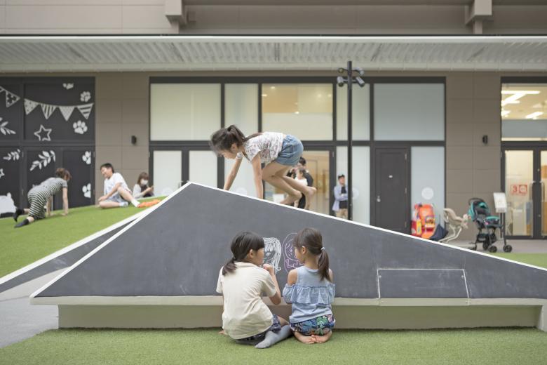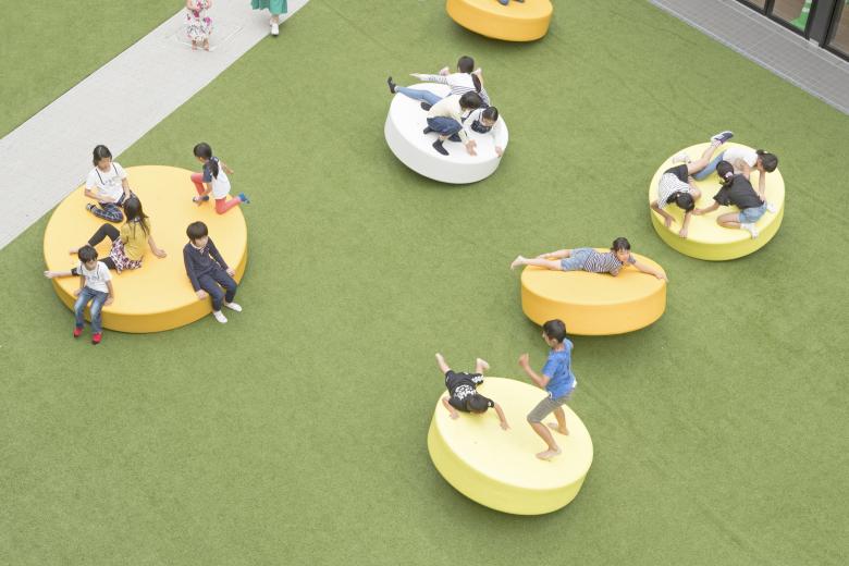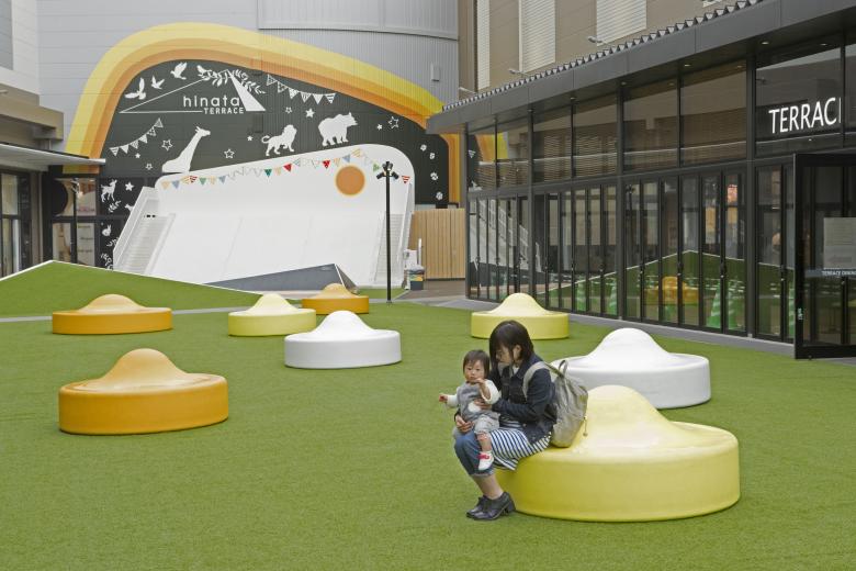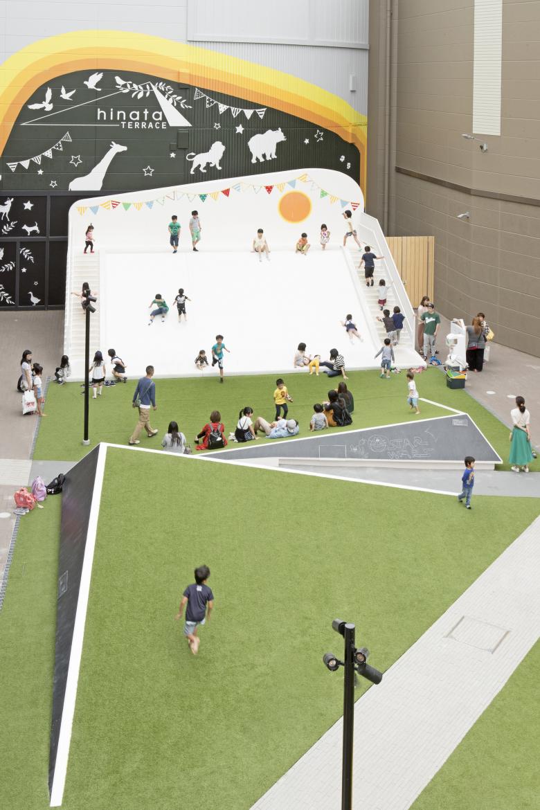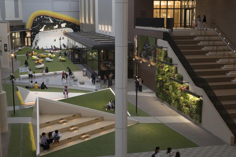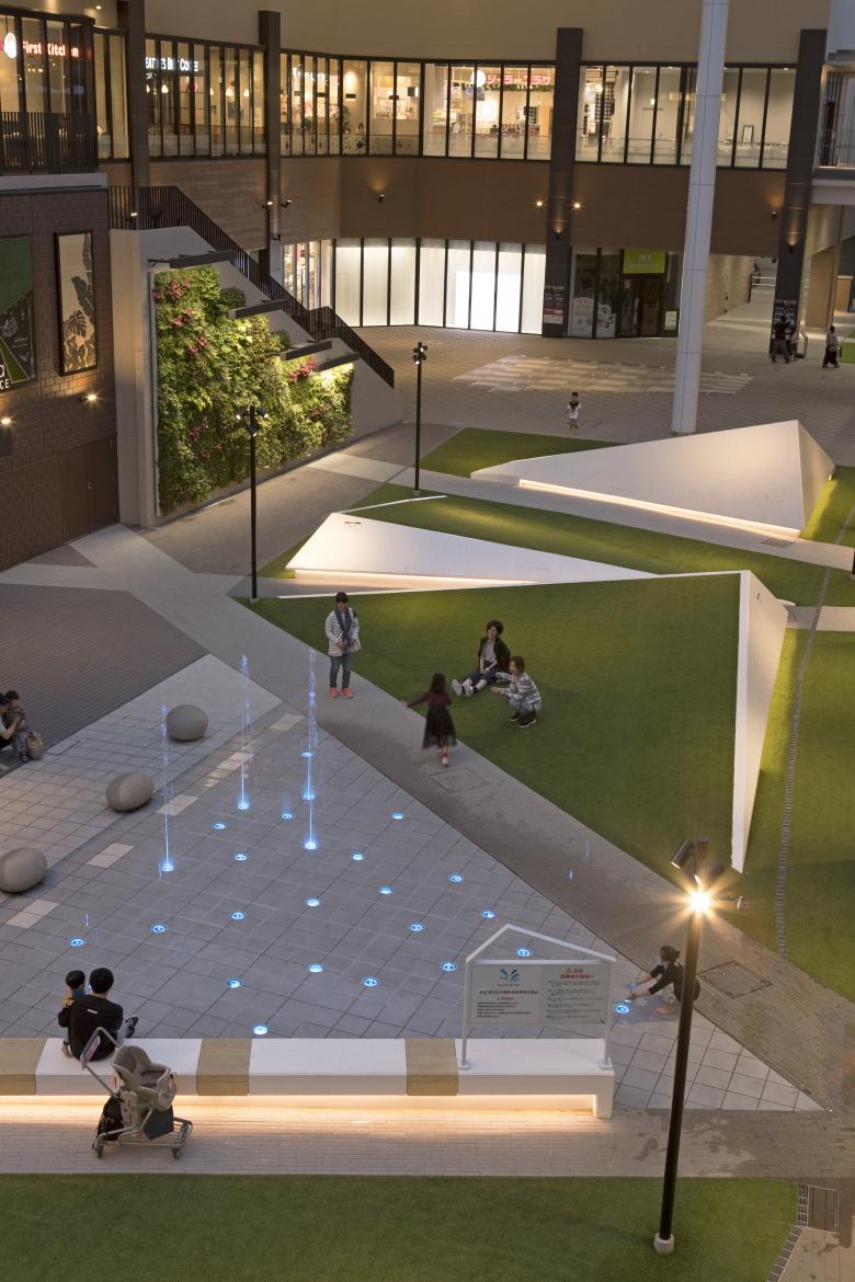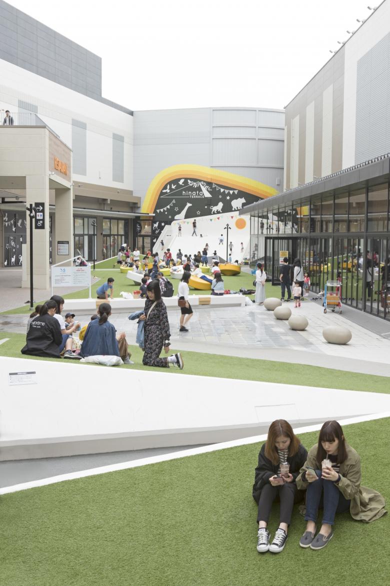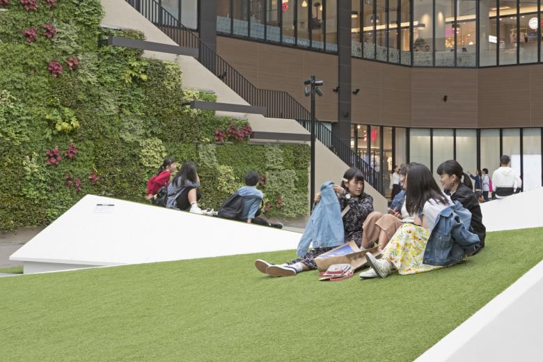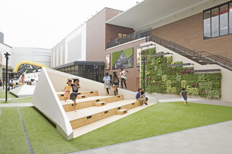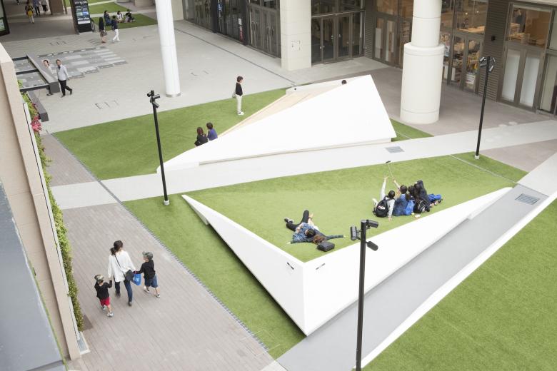 Sections of the lawn are raised at an angle like a mound, and they can be used for people to stretch out and relax, or to view various activities inside and outside of the stores.