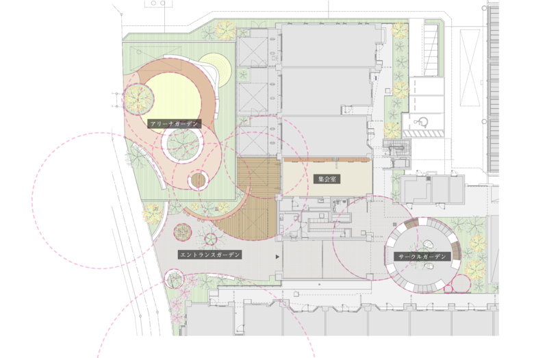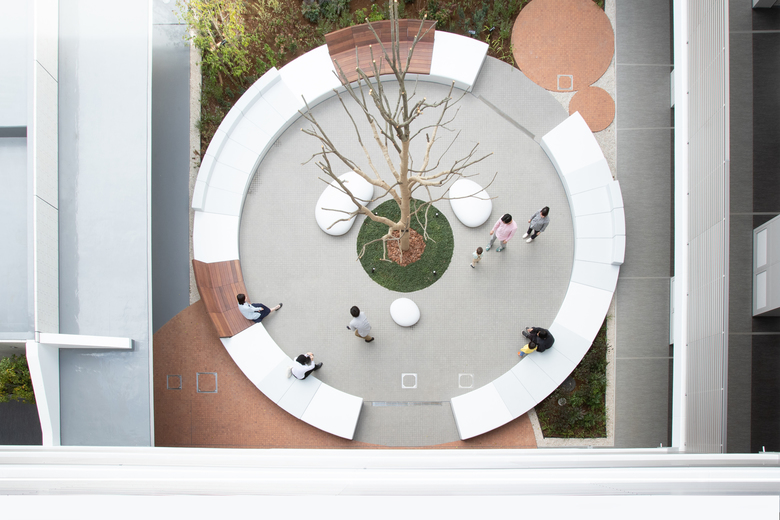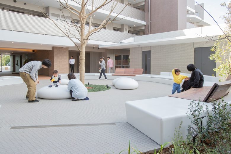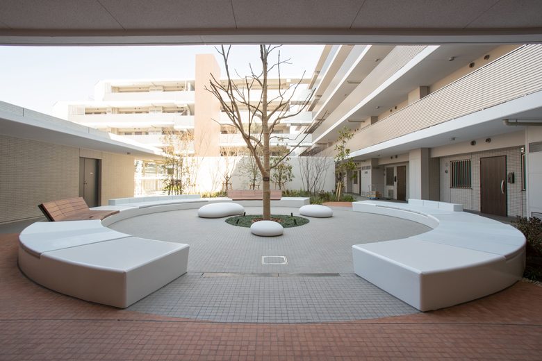 Duo Hills Minami-Machida THE GARDEN is situated near Minami-Machida Station, which has become a popular area due to recent developments, including the construction of large-scale commercial facilities near the station. Many people have moved to this area and a new community is growing. Our concept for the landscape design was "circles that bond," and we placed many features that allow activities within the garden to be visible and ready for interaction. In doing so, we hoped to make a new addition to what the town has to offer. Inside we created three areas: the entrance approach, an inner circular garden that functions as a communal space, and the "arena garden" public area. We placed a large ring of sofas in the inner circular garden that allows people to sit facing each other while enjoying natural elements. In the entrance approach and the arena garden we used a design that incorporates various linked spaces with circular motifs that join the residents with people who live in the wider area. Our idea was that these spaces would work as a bond between the different groups.