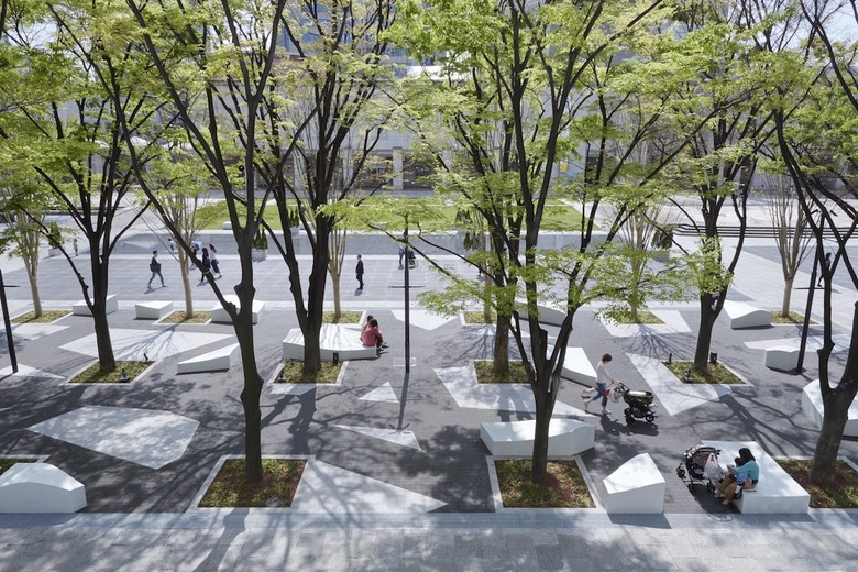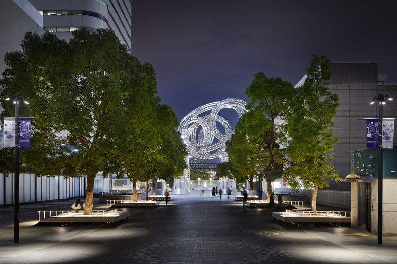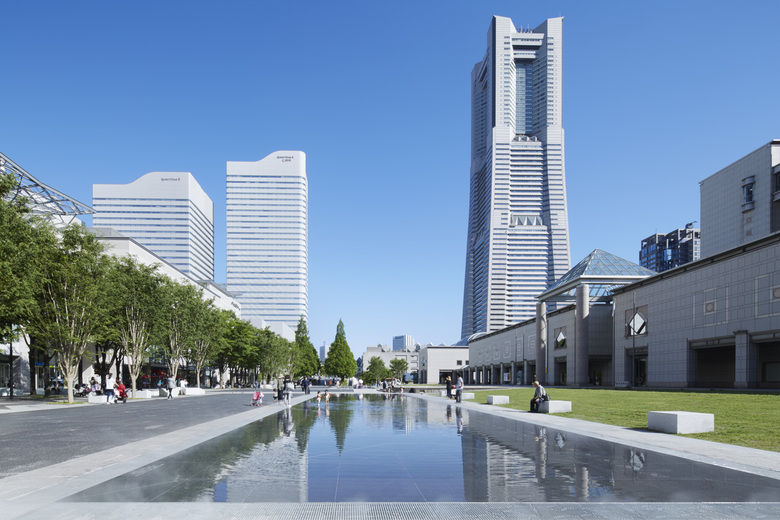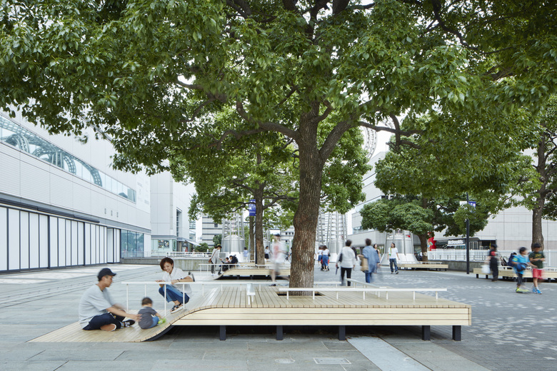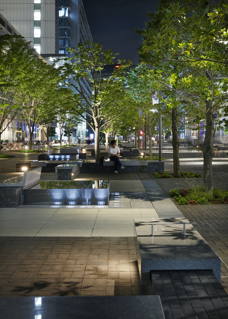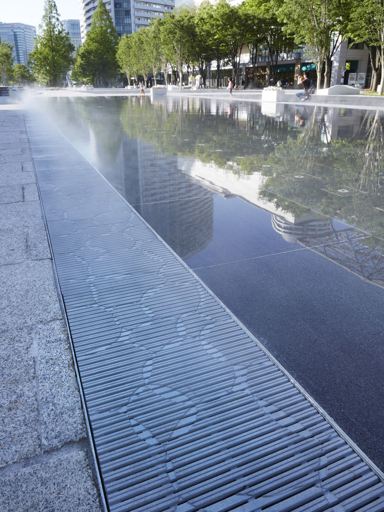 The park is divided into three areas, with the themes of “sea”, “ship” and “port”. The “sea” area has many water related features that distinguish the port town of Yokohama, such as a large plane of water, wave shaped benches, ripple mark motifs on gratings and pavements, and water fountains with markings representing the rivers of Yokohama. In the "ship" area, raised deck-like furniture with distinctive white railings are inspired by ship designs and a glass cascade fountain can also be found. In the “port” area, names of ports around the world are etched into the brick benches that were modeled from a pier. Water fountains create soothing sound around a three dimensional water feature. Water, green, breeze, and light that represents the port town draw people to the location to form an integral part of a new kind of city park scape.