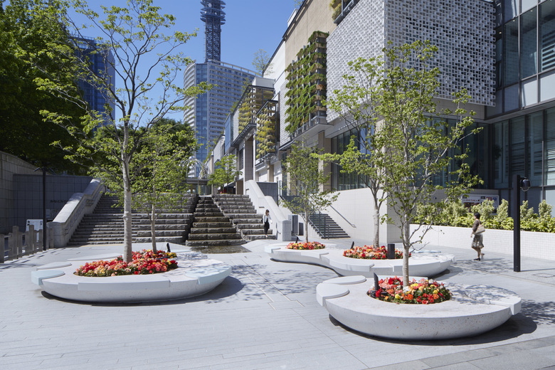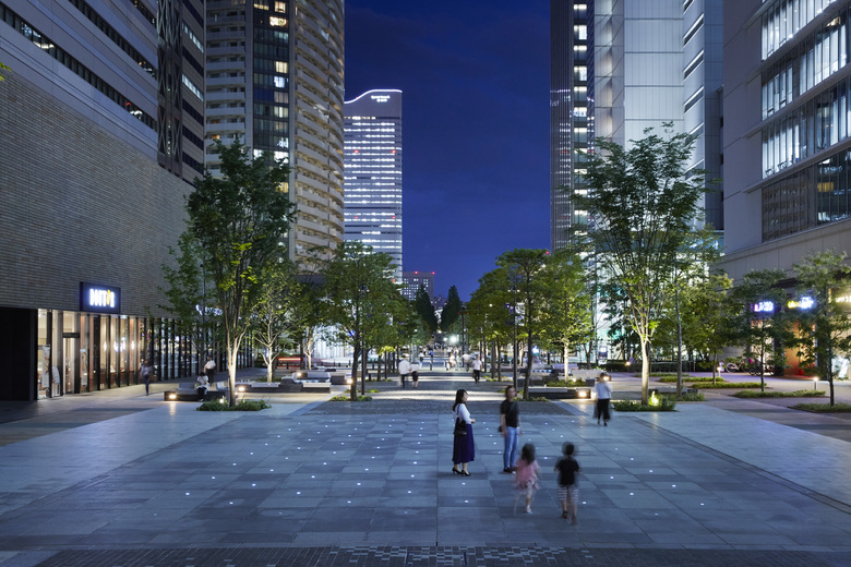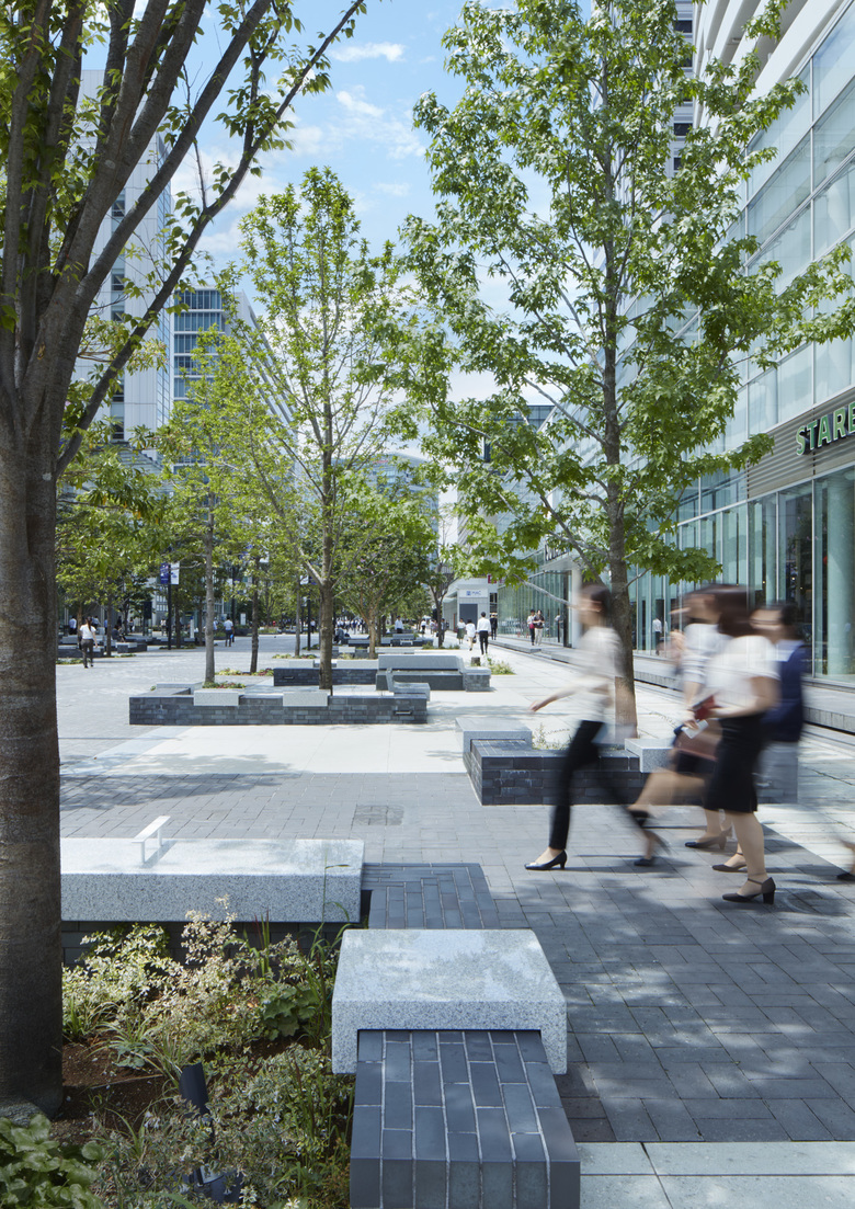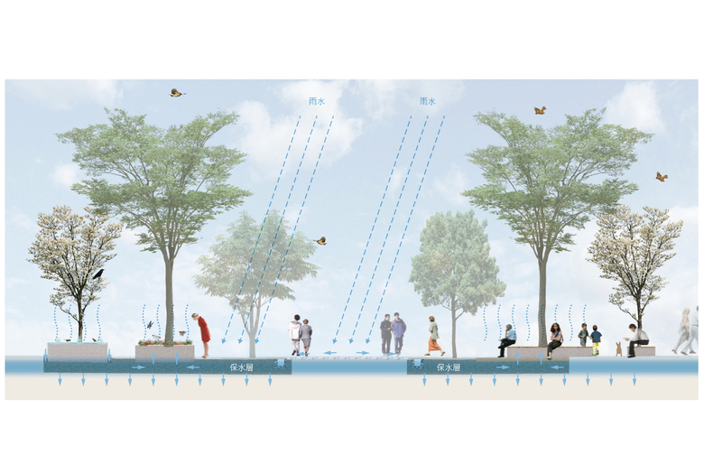 A renovation project of the Grandmall Park, a 700 meter long park located at the center of 21. Designated a “Future City” by the Japanese government, Yokohama city decided on the theme “Green x Smart Park” in constructing this city park. One main feature is vertical “water circulation” created between the sky, plants, permeable surfacing, and the expansive crushed stone water retention layer located underground.