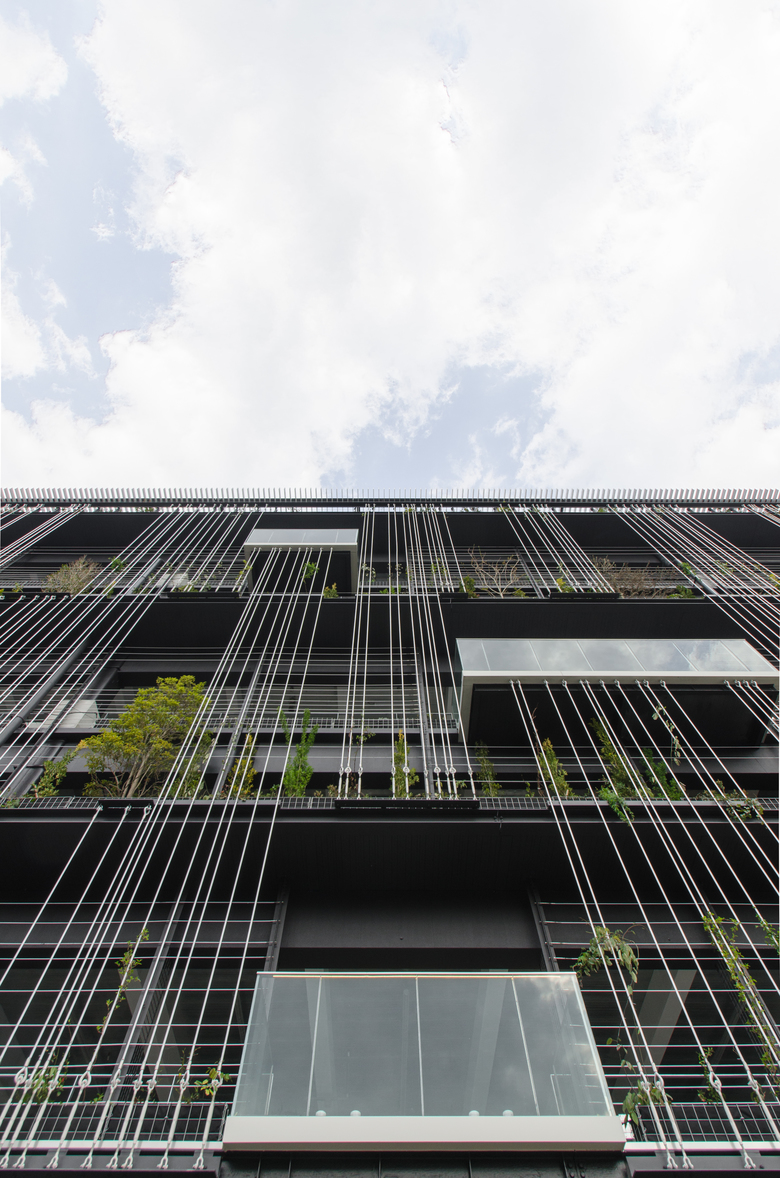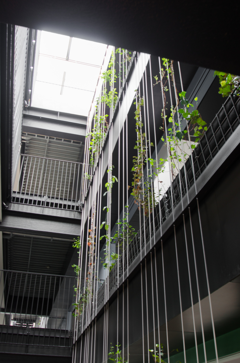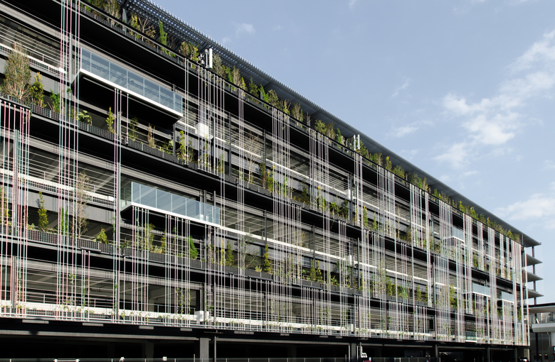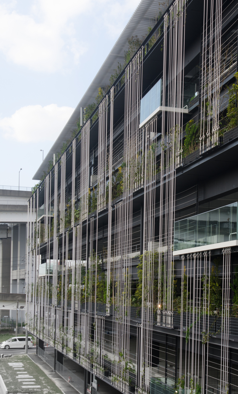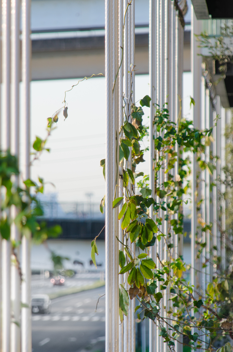 Here we have undertaken a green wall project for a newly opened multi-storey car park in the coastal area of Nagoya, which has seen an increase in development of commercial and entertainment facilities in recent years. Along the sides of the 22.59 meter tall, six-floored building, wires have been stretched for vines to climb. Trees of various sizes were placed in-between the wires to emphasize the greenery. We have tested various vine plants at the location to select the those that can withstand the harsh coastal conditions. SUS wire with white PVC coating was used as the base material for the green wall, and they are visible from the outside. By working something that are normally hidden into a part of the design, we have aimed to retain the design features even during seasons with less foliage.