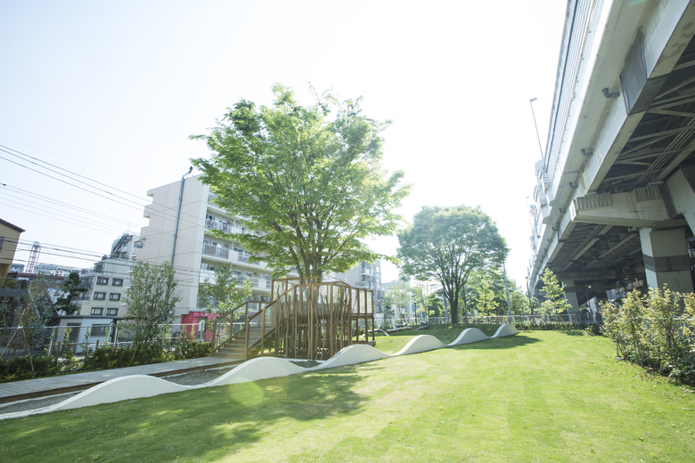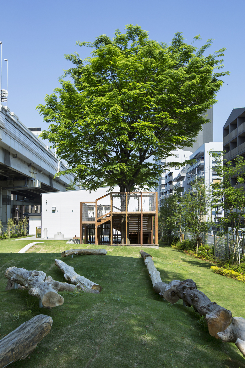 The east side with indoor and outdoor play areas are “be open” to the public with things made clearly visible from the outside. A wooden deck walkway leads out from the play room like a pier to a large Japanese zelcova tree. The tree is also surrounded by wooden decking where children can run out barefoot to what feels like a tree house. The playground is divided up dynamically with reinforced concrete retaining walls, where children can play on varying terrain such as wavy mounds. Drawing inspiration from the logs that used to float in the local log pools in the past, we placed logs on the wavy mounds like balance beams. These logs were actually cut from trees felled from the grounds.