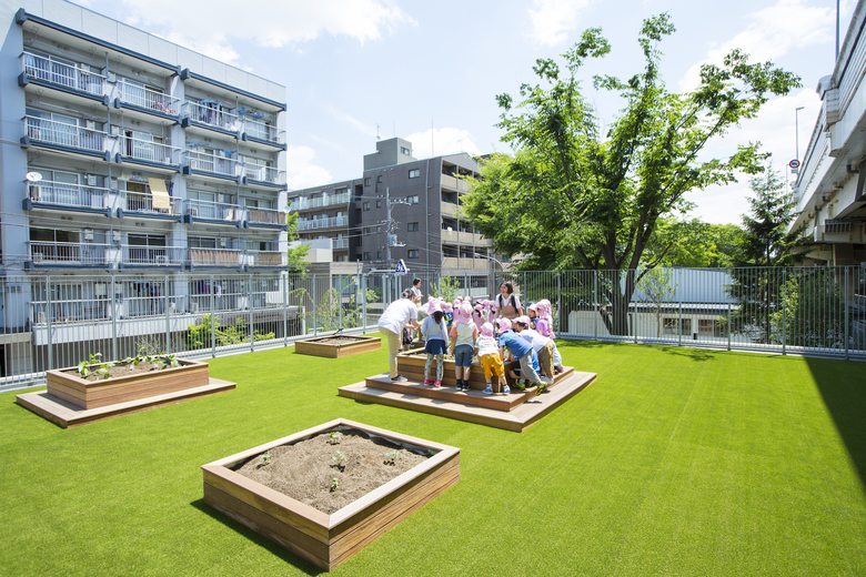 The nursery entrance is located facing the communal path that cuts through the nursery grounds. Created as a small park of its own with benches under the shade of trees, it is a place for people to “mingle.” People connected with the nursery such as the children, parents, and teachers, as well as anyone from the close community, are all welcome. The stepped benches are fun for children to hop on and off.