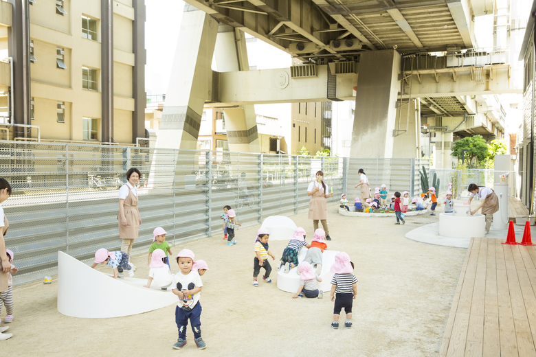 A play garden for 0-1 year olds is located south of the building, the same side as the raised highway with a public footpath beneath it. We placed perforated fencing to gently veil the section. This protects privacy while still allowing the community to "feel" the presence of the children and activities. We’ve also designed and incorporated various playground equipment for the children to enjoy.