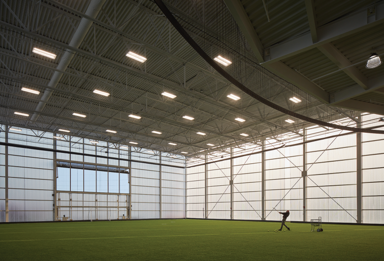 Transforming the hundred-year-old structure presented significant challenges, especially to efficient energy use. New insulation regulates heat flow in the historic portions of the building, while the polycarbonate façade of the new field house provides advanced thermal insulation and abundant, diffuse natural light throughout the day. In addition, a radiant panel and slab system harnesses energy from the Rock River for most of the Powerhouse’s heating and cooling needs, improving comfort within the building and maintaining the highest air quality, while also minimizing total energy use.