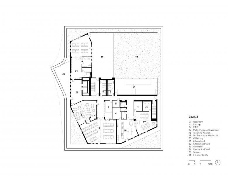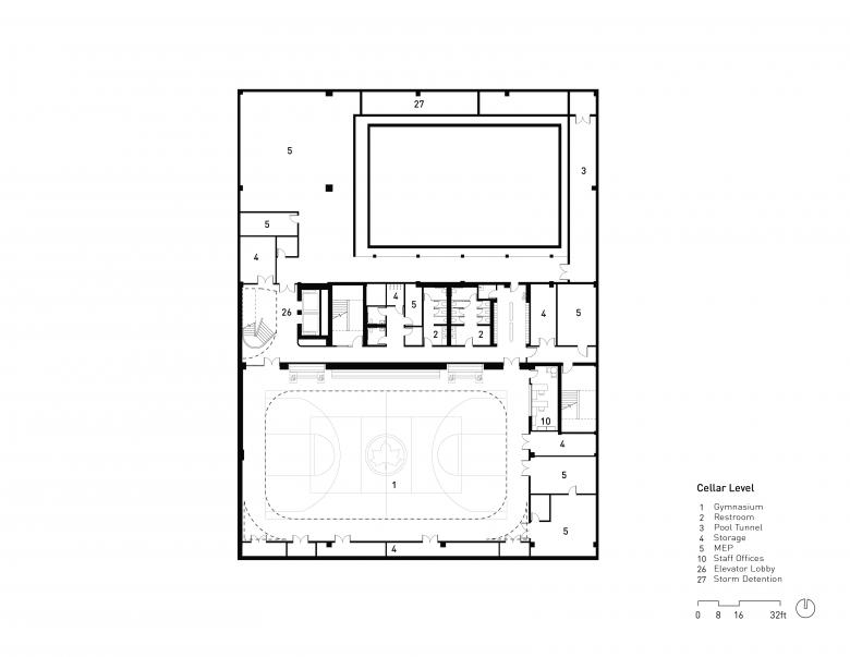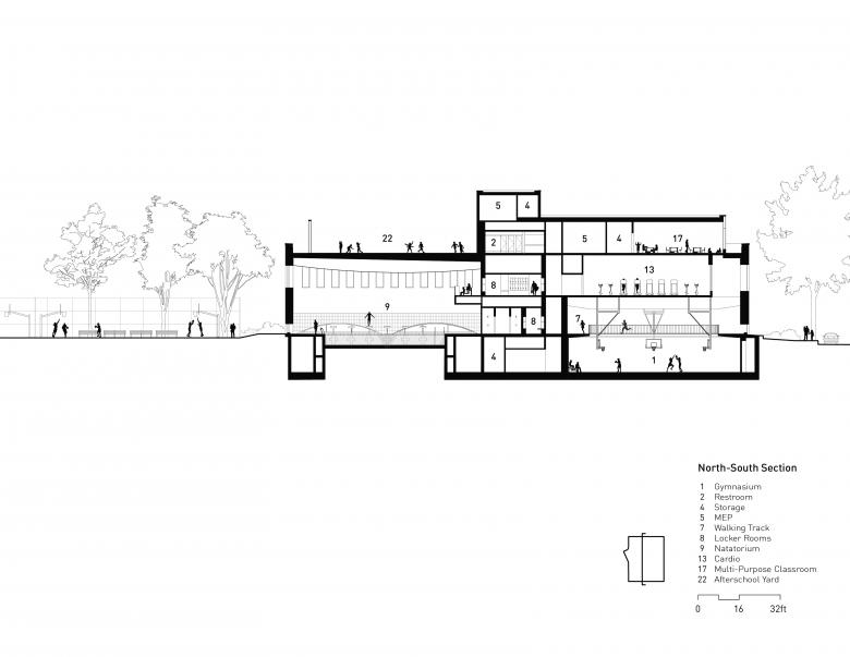 The Center’s three lower levels are dedicated to recreation and exercise. They house a gymnasium, walking track, and double-height competition-grade swimming pool—all of which are visible from the lobby—as well as dance and fitness rooms. Openings between floors maximize visual and physical connections between programs and establish a vibrant and airy atmosphere. The Center’s upper level is designed to host a range of community amenities from afterschool programs to a media lab, named for East Flatbush business leader Dr. Roy A. Hastick, Sr. Daylit learning spaces for kids, teens, and adults lead outdoors onto a wrap-around rooftop terrace and gardens where people can connect with nature in a peaceful environment that nurtures their physical and mental health.