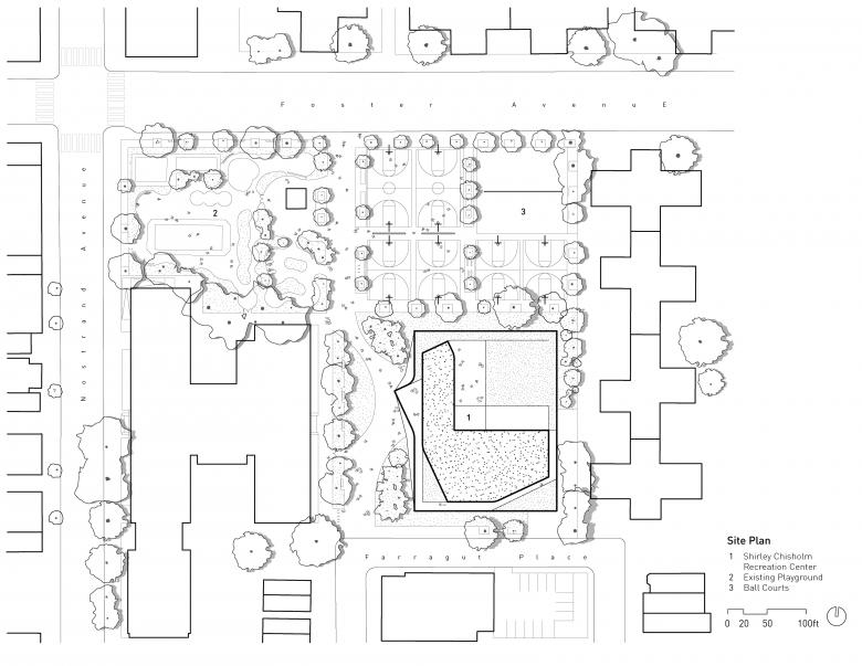 The Shirley Chisholm Recreation Center establishes a welcoming social hub for fitness, recreation, and learning in the East Flatbush neighborhood of Brooklyn. Extending out to greet the neighborhood, the Center’s sculpted architecture and transparency draw residents into its new public spaces that support health and community life.