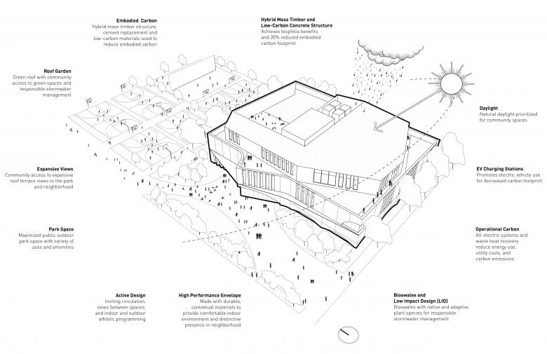 To achieve a low carbon footprint, the team carefully modeled and optimized the Center’s energy use. The design includes a high-performance building envelope, an energy recovery system, and all-electric heating and cooling. A whole-building life-cycle assessment guided material choices, helping to reduce the environmental impacts of extraction, manufacturing, and transport. The design also prioritizes healthy and durable materials, such as mass timber which performs well in humid pool areas. These efforts are complemented by expanded tree cover, green roofs, water use reduction strategies, and a responsible stormwater system, contributing to a healthier, more connected community and environment.