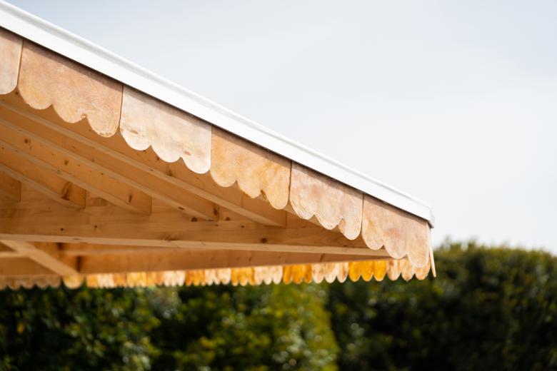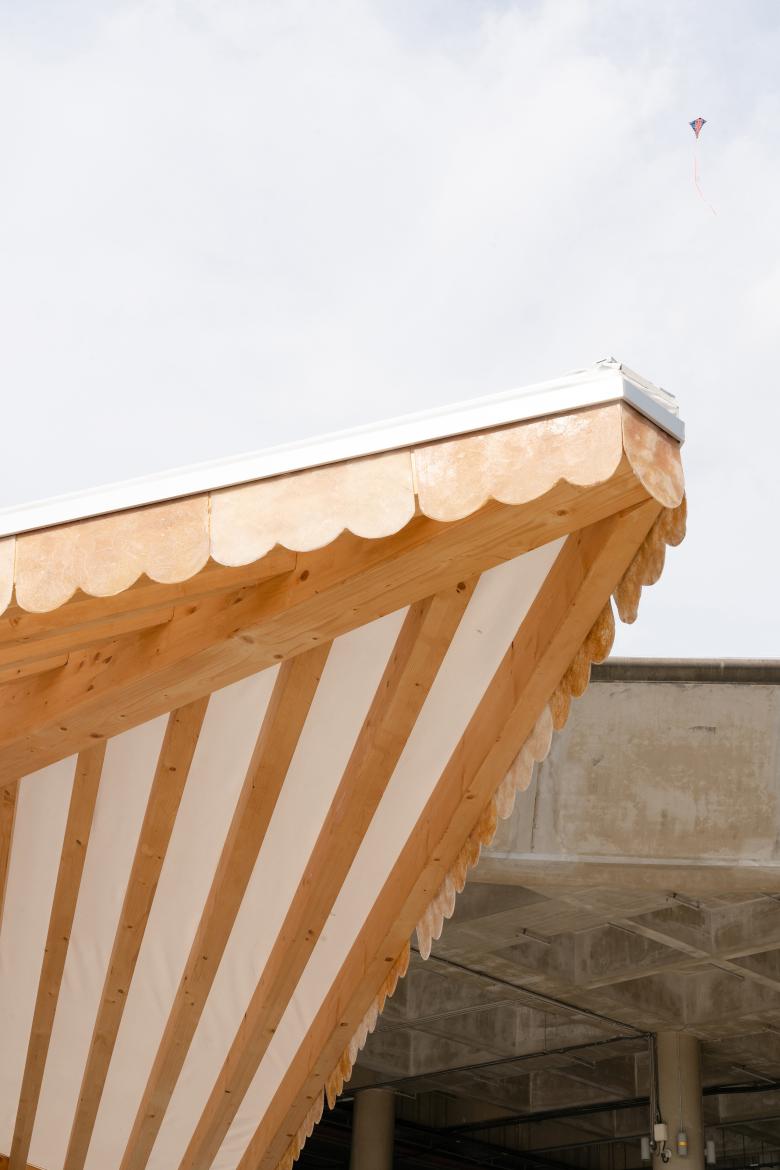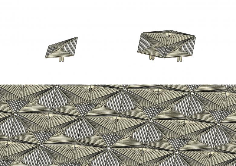 The +Pavilion architectural and structural form was inspired by the Swiss cross. Two ‘nested’ sets of tapering columns and purlins members sprout from this geometry to form the 5m cantilevering supports for the ruled surface roof form. The main structure is made from Swiss glued-laminated timber (glulam) fabricated by a 5-axis CNC machinery which has also enabled subtly rotational curved roof rafters members to be fabricated. The single module manifested in this pavilion is only part of this geometrical tessellation. Two sets of triangulations are conjoined in a diamond configuration, forming a 120 degrees angle at the pair of lower opposite roof ends. This configuration allows three modules to form a sizable shelter and infinitely proliferate itself into a woven shelter tapestry.