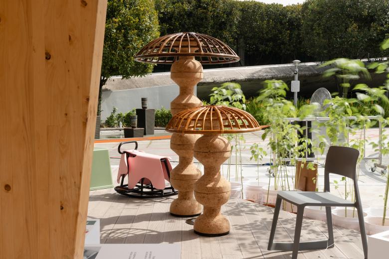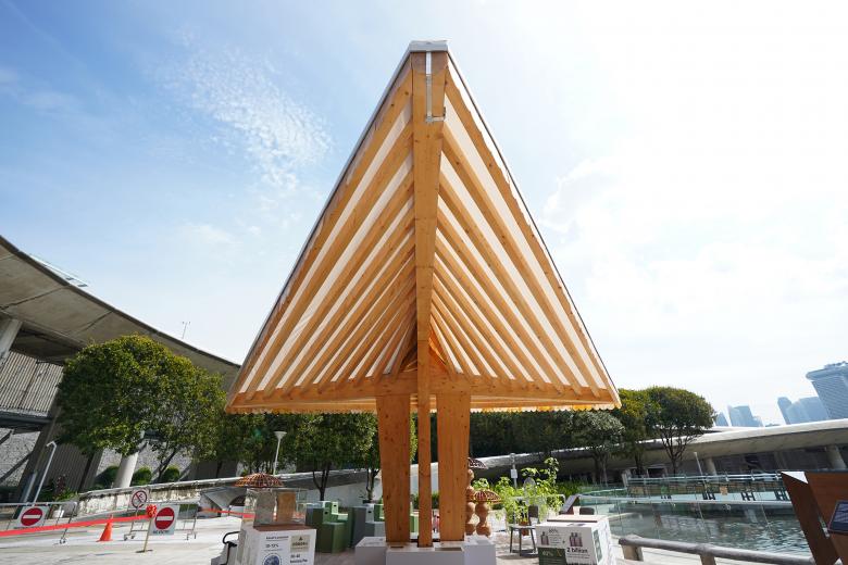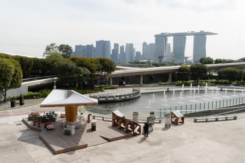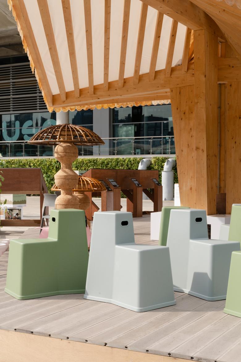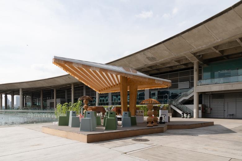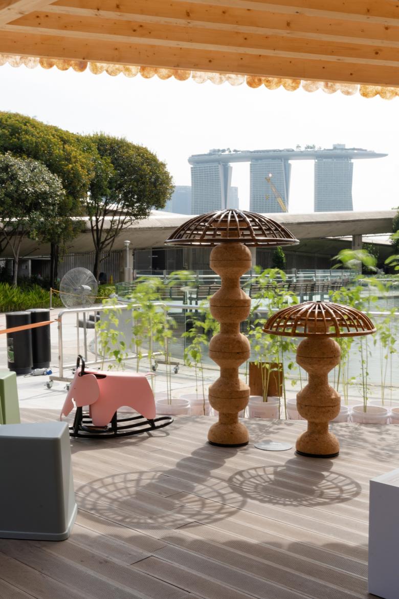 The +Pavilion is designed to attract attention, and encourage engagement with fellow visitors. The furniture on the pavilion, while providing a place to sit, relax, and interact, were curated to demonstrate different aspects of sustainability, from natural to recycled materials. Cork and rattan furniture are creatively used to highlight natural materials and demonstrate the capabilities of recycled polypropylene, composed by a mixture of recycled household waste. Multiple workshops and gatherings are planned to drive more discourse around sustainable building design and construction as part of the +Pavilion program at Marina Barrage.