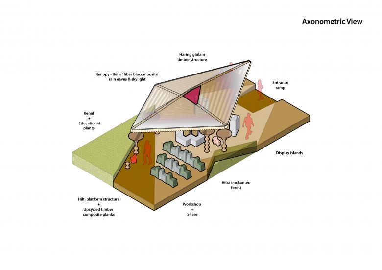 Other materials consist of innovative biocomposite made from the Kenaf plant as parts of the roof and boards made of recycled coffee serving as exhibition signage. It is the first time in Singapore that Kenaf (also known as Hibiscus cannabinus L, a rapidly grown tropical multipurpose plant) biocomposites are being explored as roofing components such as reinforced central skylights and rain eaves.