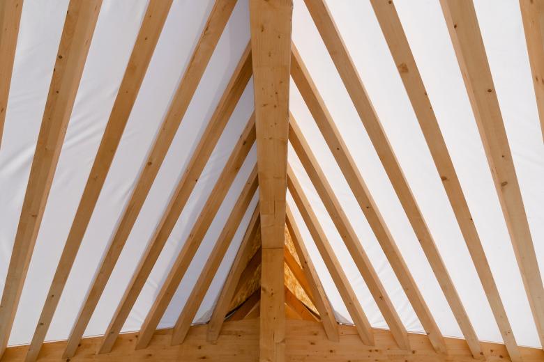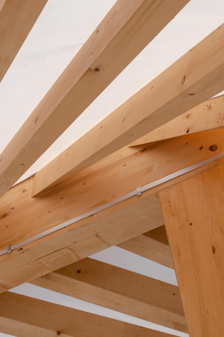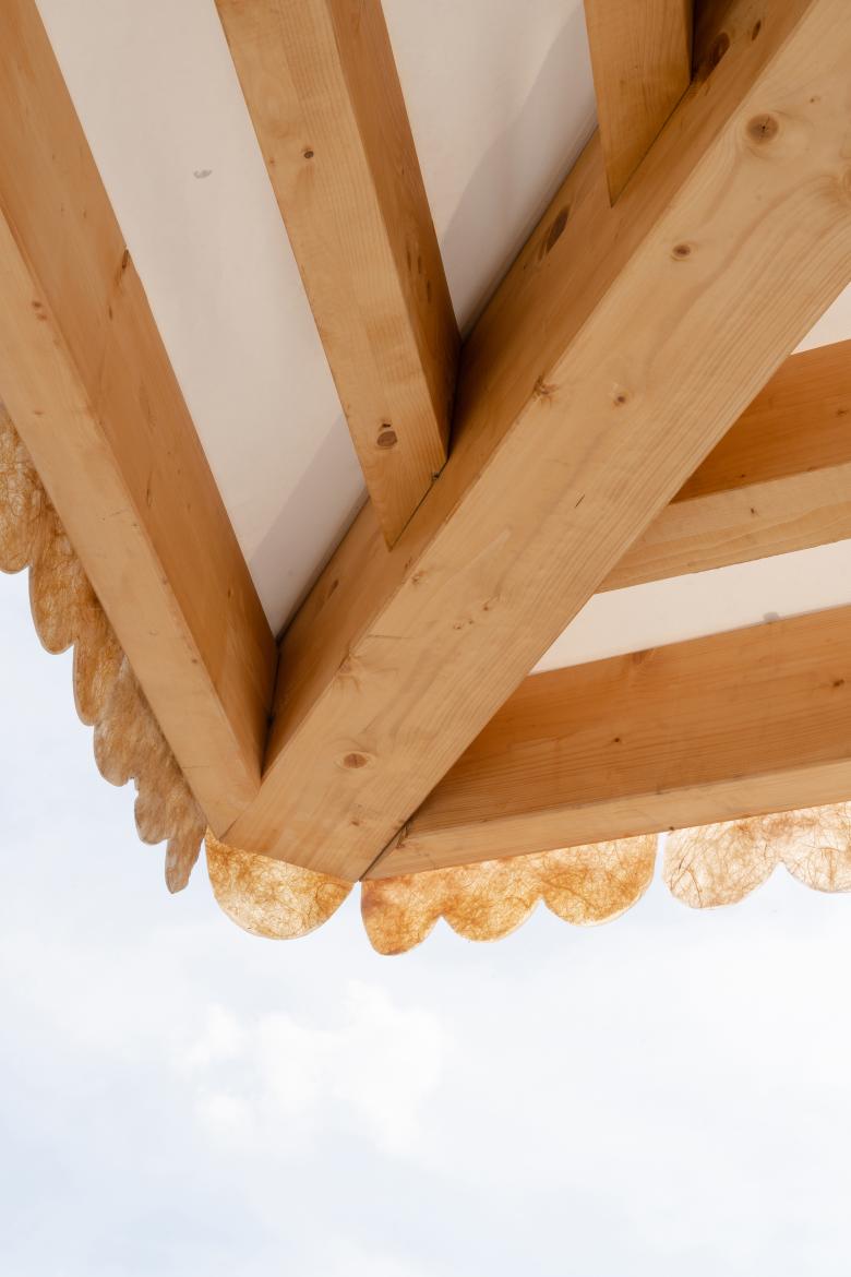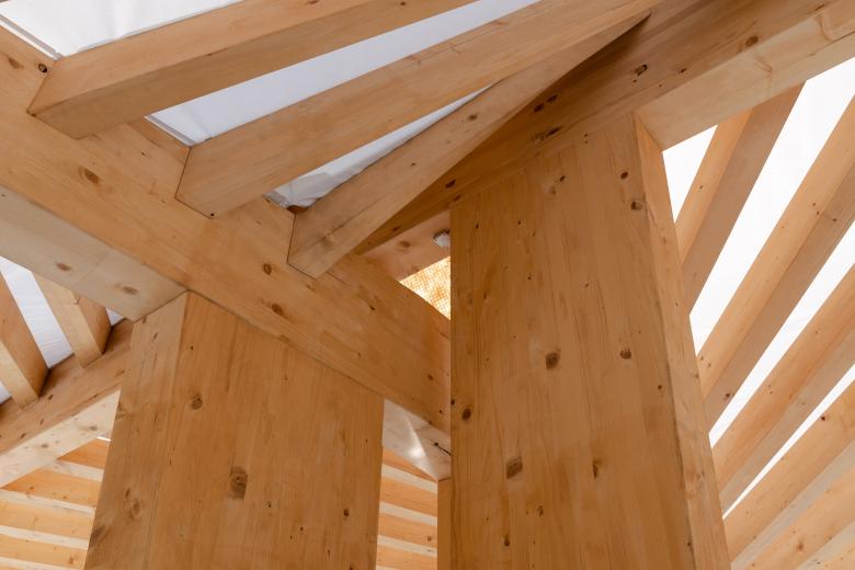 The Swiss cross inspires the structural concept of a glue-laminated timber pavilion showcasing a vignette of a sustainable built environment.