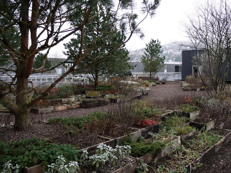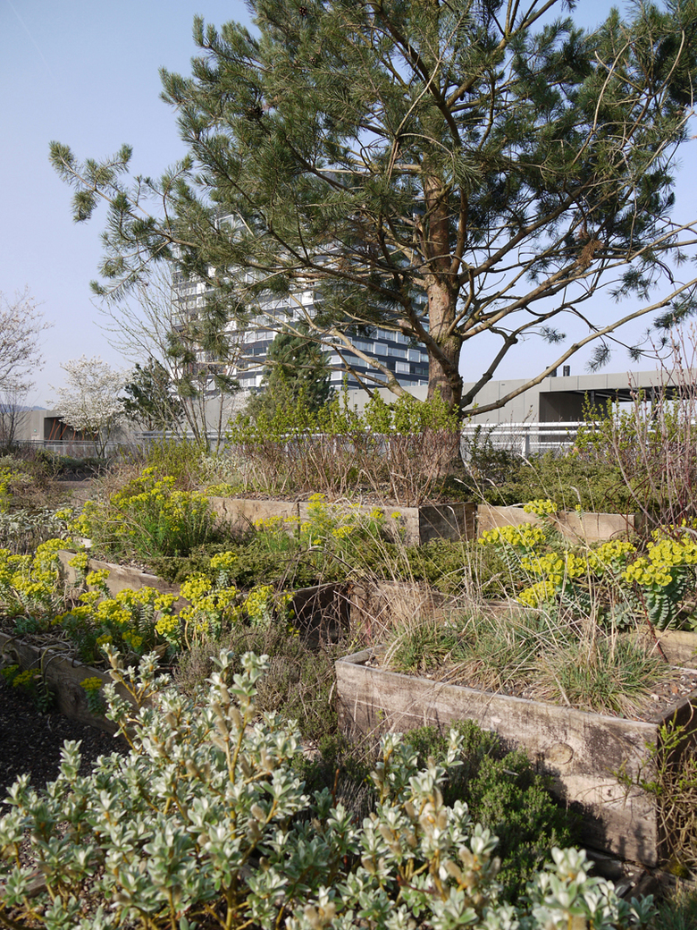 Density, urbanity and exciting intensity – 30 metres above ground in Zurich West. On the roof garden of the new University of the Arts on the site of the former Toni factory, the outdoor space creates a green oasis for students in an area where there has been a surge of new high-rises, technical buildings, chimneys, atriums and concert halls.