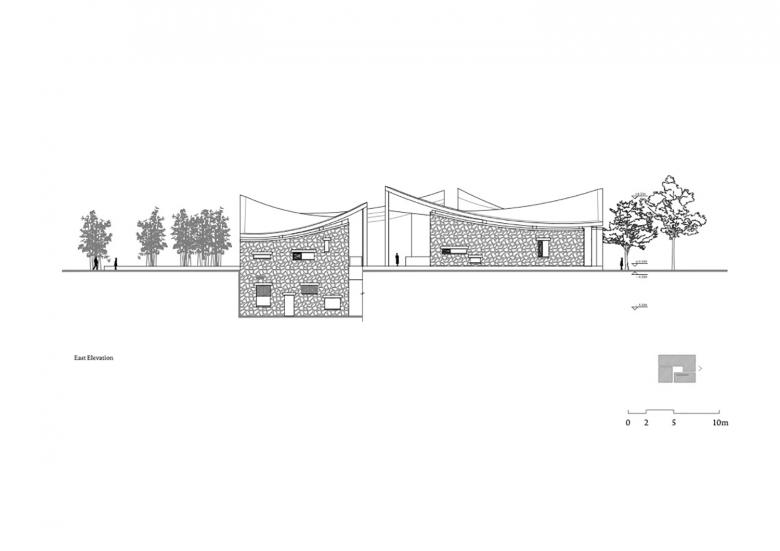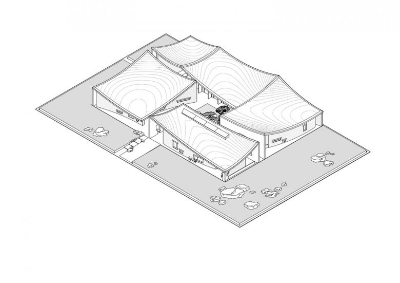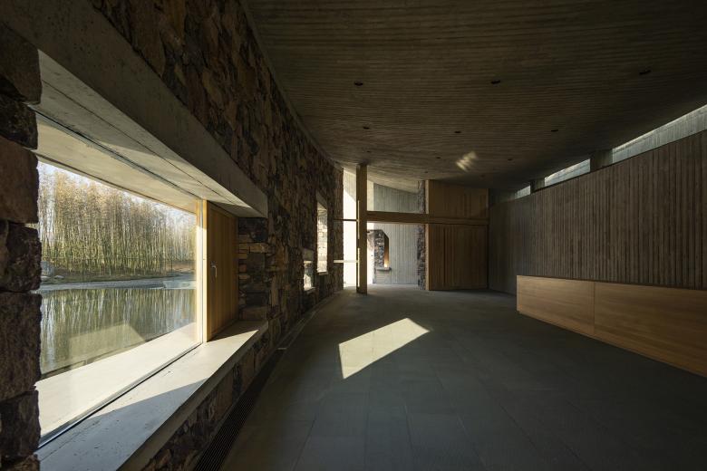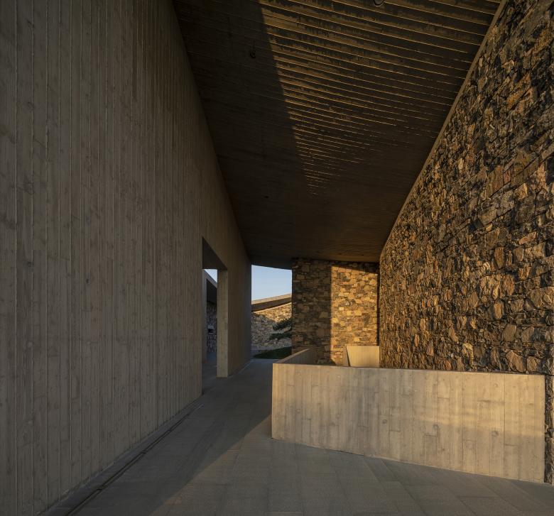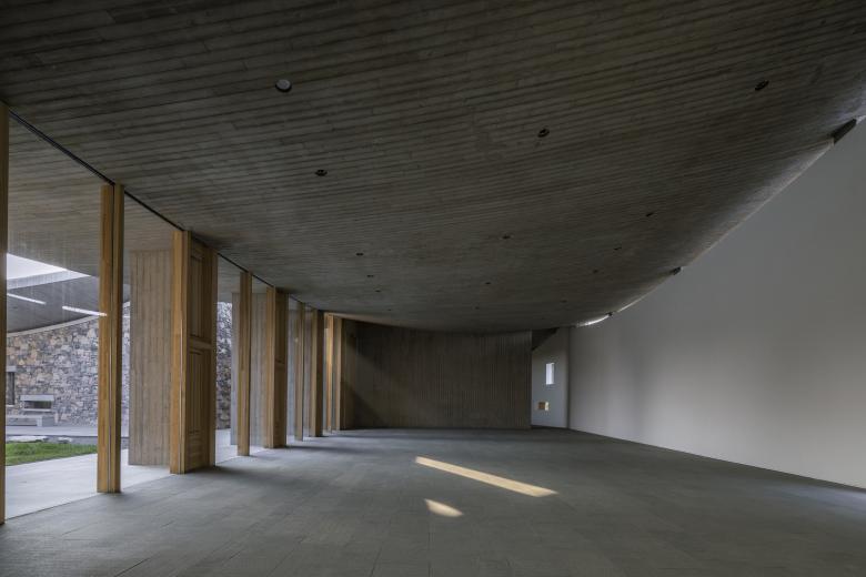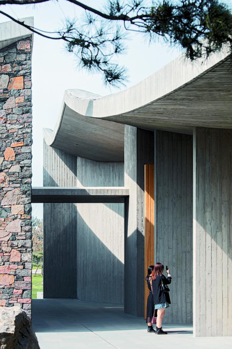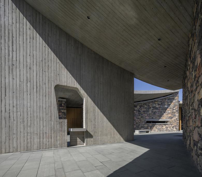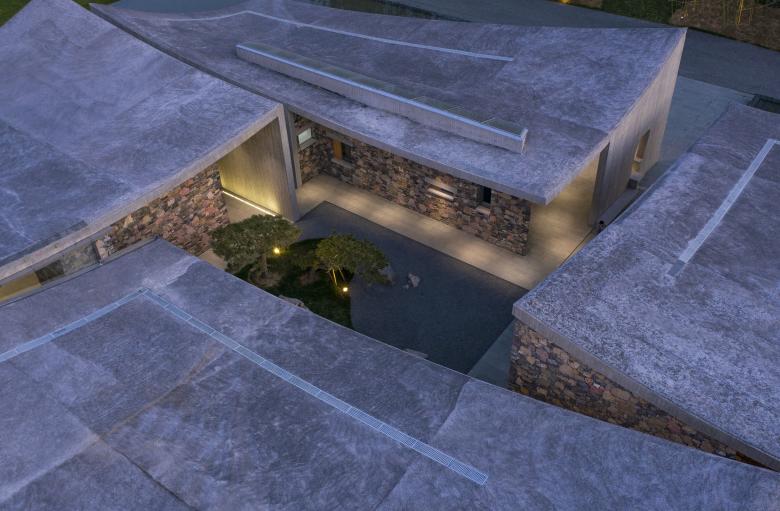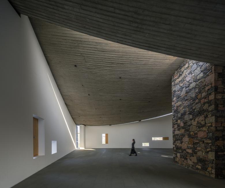The architecture is simple and relatively rough with its material characters, such as concrete roof, masonry stone wall, and so on. The hyperboloid roof sags due to gravity in nature, which also brings good tension to space. Although people are in a seemingly rectangular and simple space, due to the change of the roof, the homogeneous space becomes very tense. Some places will be tight, and some will be loose, reflecting the sense of movement and strength of the building. The roof is made of rough fair-faced concrete poured on site. The method of laying the walls is based on local rough masonry stone walls commonly used by locals, which is characteristic of northern China, especially in Shandong Province.