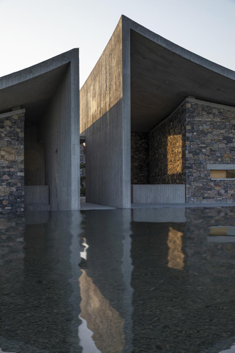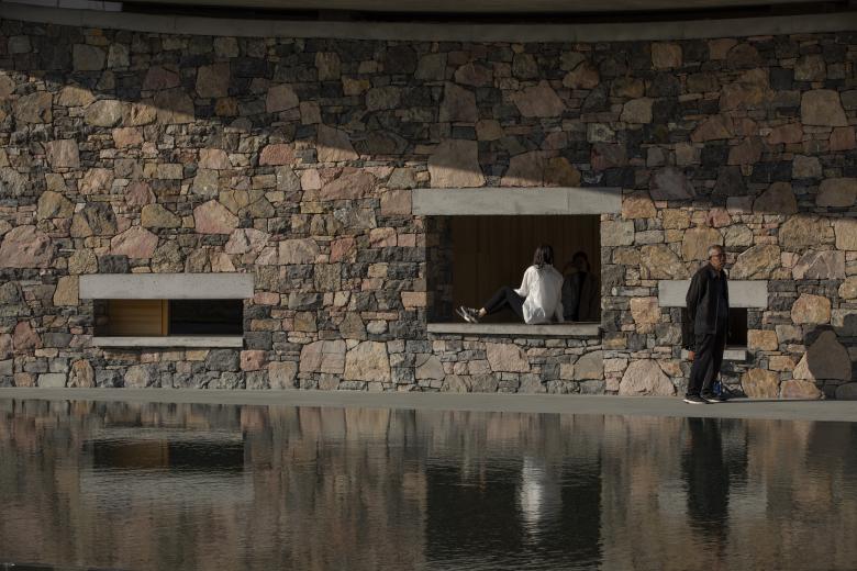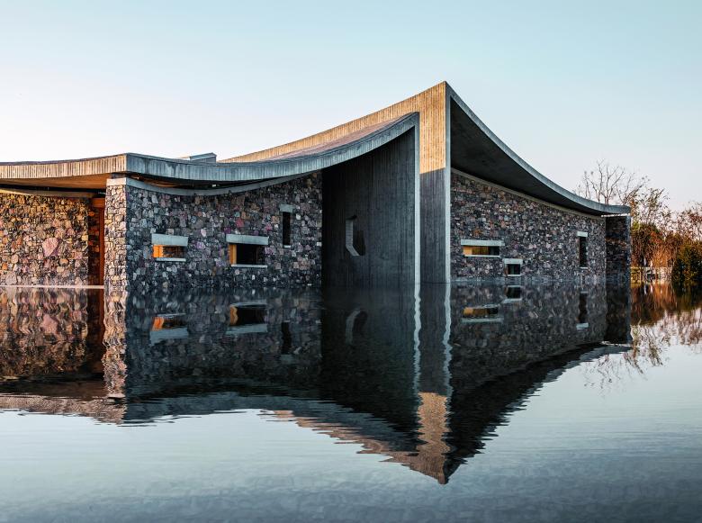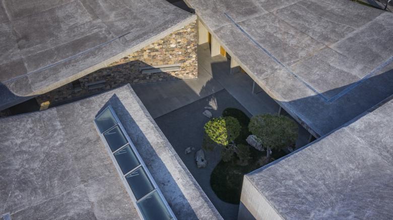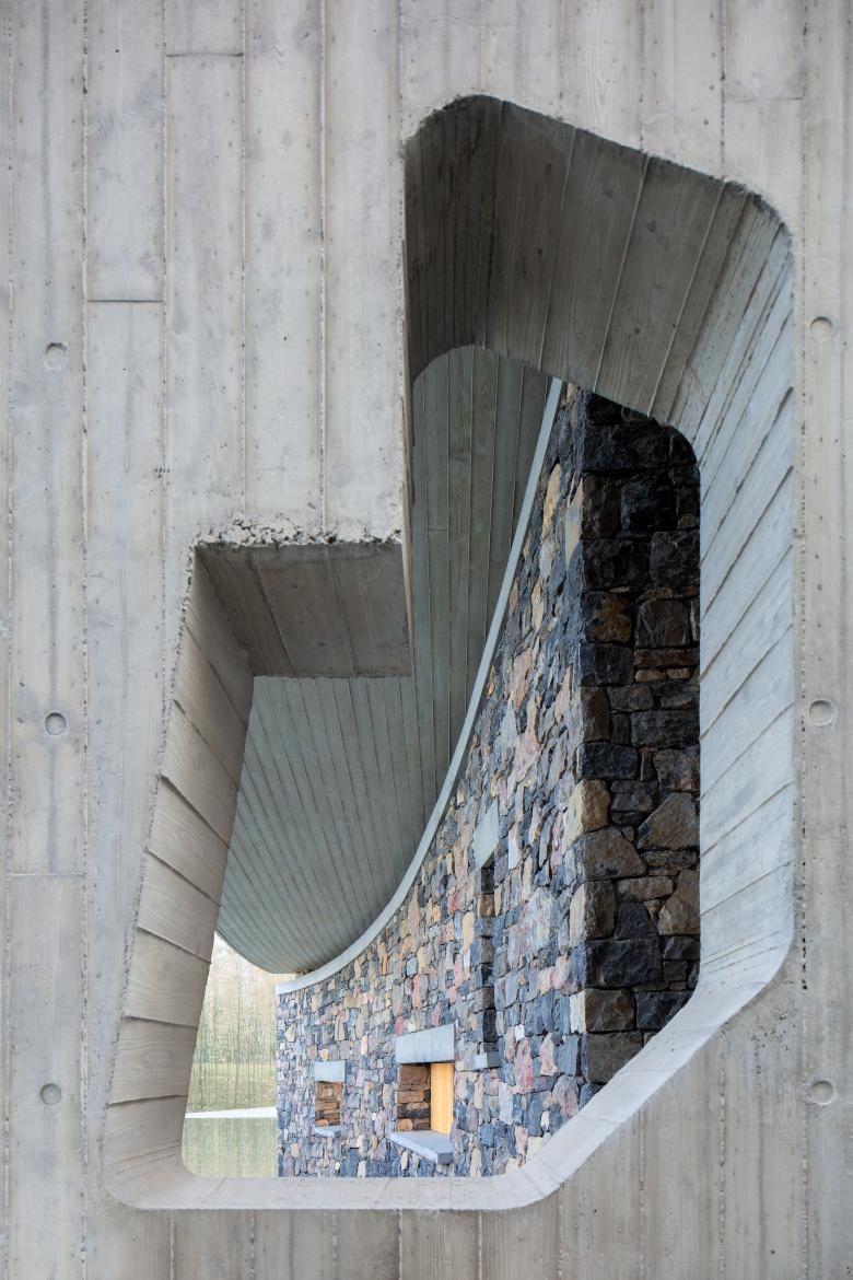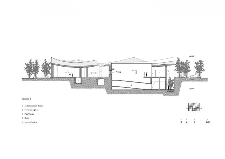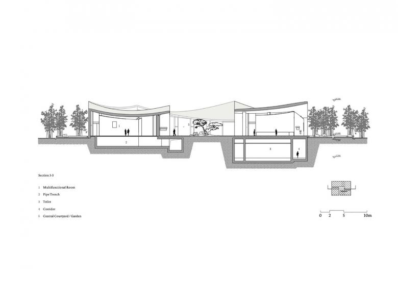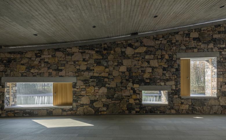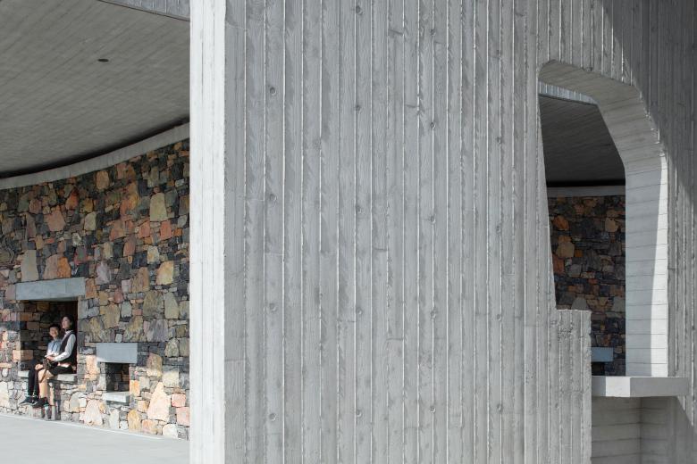 The architecture is simple and relatively rough with its material characters, such as concrete roof, masonry stone wall, and so on. The hyperboloid roof sags due to gravity in nature, which also brings good tension to space. Although people are in a seemingly rectangular and simple space, due to the change of the roof, the homogeneous space becomes very tense. Some places will be tight, and some will be loose, reflecting the sense of movement and strength of the building. The roof is made of rough fair-faced concrete poured on site. The method of laying the walls is based on local rough masonry stone walls commonly used by locals, which is characteristic of northern China, especially in Shandong Province.