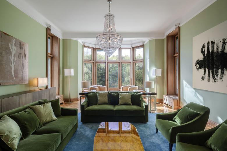 The Mid-19th century NEO-GOTHIC VILLA is a jewel hidden in the hills of the elite Gold Coast of Zurich. We refurbished interior and simultaneously preserved historical building. The selected materials and a jewel-toned colour palette set the environment warm. The pool billiard and foosball table form a contrast to the living area with fireplace and yet a relaxed environment prevails. The soft blue and green tones combination of the salon is accentuated by the lush garden in the background. The subtly gold-painted wall enhances the flamboyant dining room arrangement of eight velvet clad chairs surrounding a bespoke customised marble table. More at https://www.studioforma.ch/architecture-projects/interior-design/neo-gothic-villa