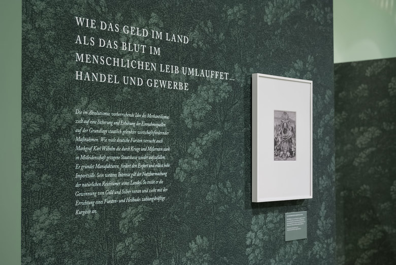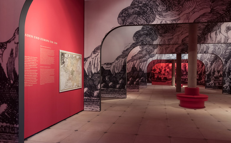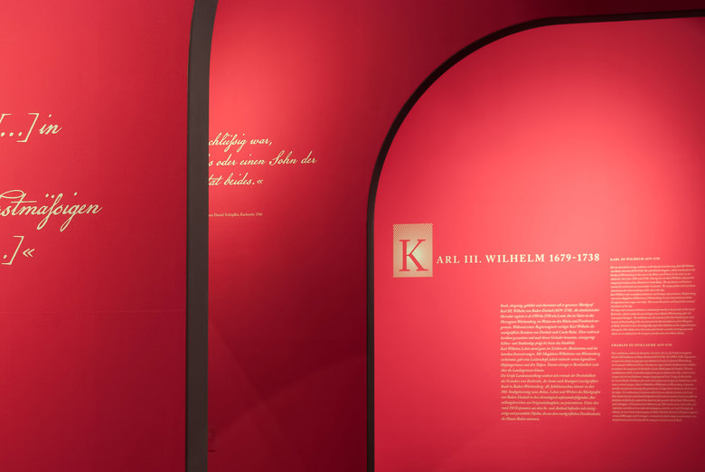 Die Landesausstellung führt chronologisch durch das Leben des badischen Markgrafen und Karlsruher Stadtgründers, das anhand seiner großen Lebensthemen präsentiert wird: Barockes Theater, Stadtplanung und Gärten. Die gesamte Ausstellungsarchitektur ist auf die Perspektivwirkung der Zentralachse, das klassische Symbol des Barock, hinzugeschnitten.