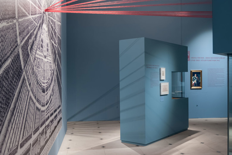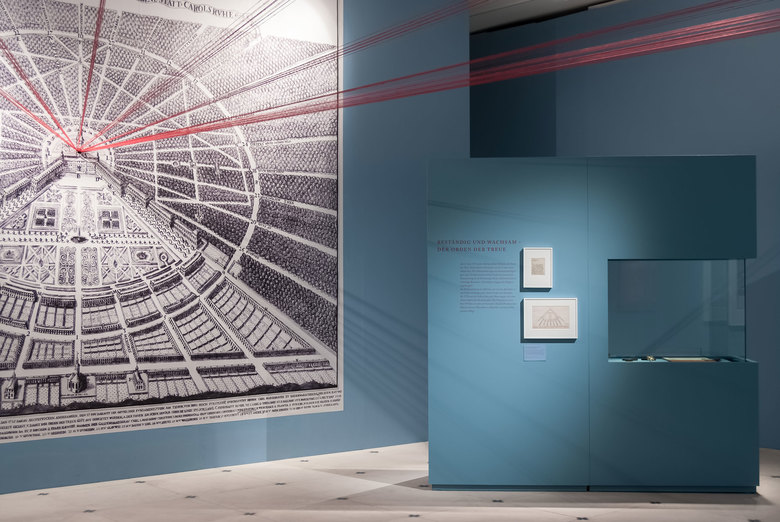Die roten Strahlen bündeln sich im Zentrum des historischen Stadtgrundrisses von Karlsruhe, der vergrößert an der kurzen Seite des Raumes hängt.