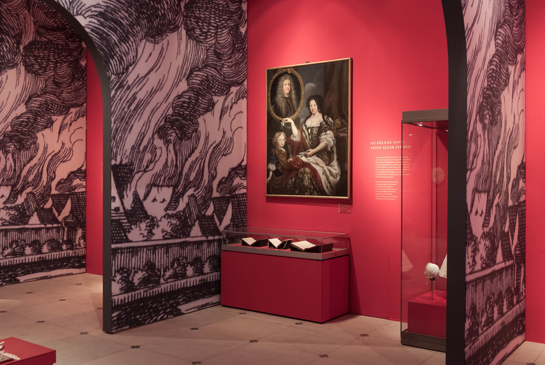 Im ersten Raum betritt der Besucher eine Gassenbühne. Sie zeigt ein Landschaftspanorama der brennenden Stadt Durlach - ein Motiv, das die Dramatik der damaligen Zeit illustriert, die von Kriegen und Zerstörung geprägt war.