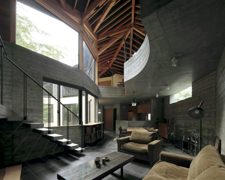 The sloped property has an elevation drop similar to that at the end of a promontory, which made the question of how to place the building on the land a structural question of ongoing concern. In order to avoid an overly large, deep foundation, we alloted about one-third of the building footprint to an overhang, thereby reducing the area of contact with the ground. The basic structure is comprised of reinforced concrete from the foundation through the floor of the second story, with wood above that. The upper level, which was conceived of mainly as a reading area, has the same footprint as the lower level, but by varying the shape of the triangular planes of the roof, we were able to maintain continuity. The peak is around the center of the building, while the two narrow end sections slope down to the first story via a mezzanine and a void. This ultimately creates the impression of a single roof covering the whole building, even though it is divided into multiple sections.