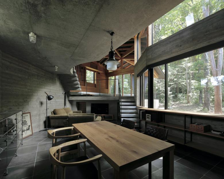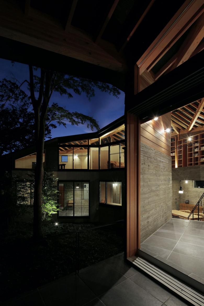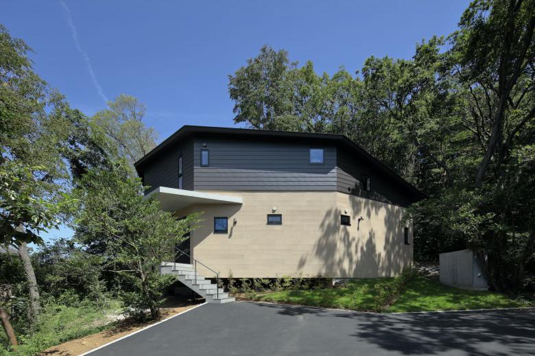 The site for this project is sloped and initially was covered in dense forest. Although the surrounding area was developed with second homes in the 1970s, this particular property had never been built on. In the process of visiting the site a number of times, we were drawn to a large orangebark stewartia tree and began searching for a way to leave it standing so that it could coexist with the architecture. Based on setback regulations and other constraints, we calculated that the tree was located near the approximate center of the area where building was possible. We therefore moved forward with a design that wraps around the tree, giving it the space it needs while still creating a relationship with it.