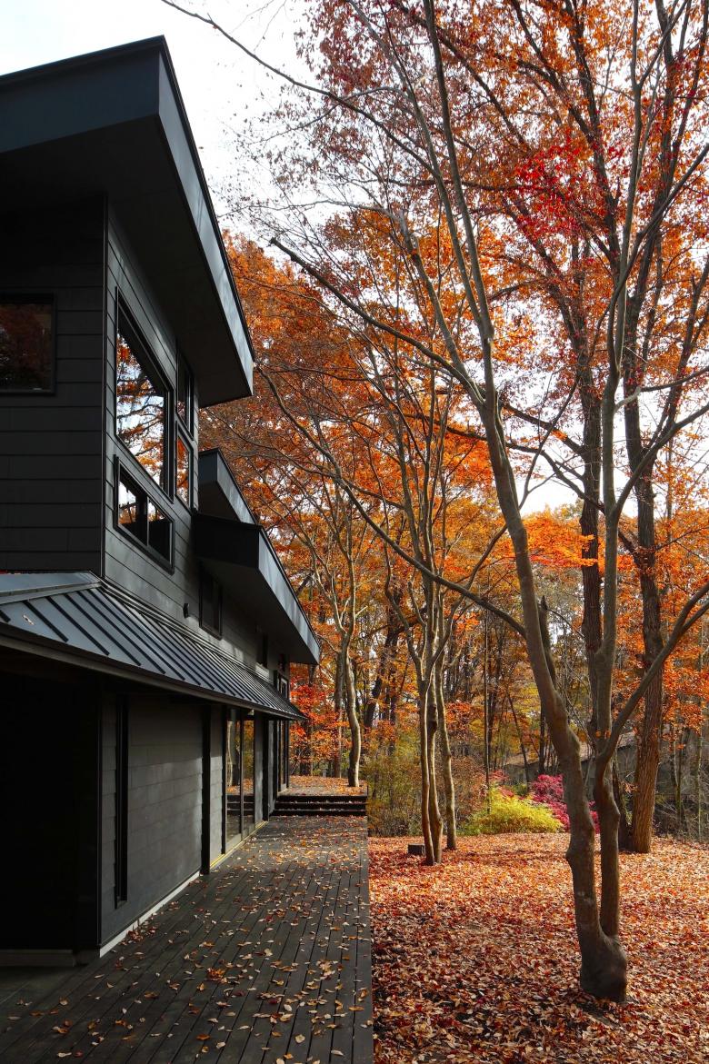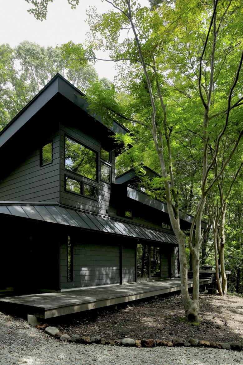 This residence was designed for a client who relocated from the city to a rural highland area with the intention to work remotely. The site is characterized by a gentle slope that runs from the west side, which faces a road, to the east before dropping sharply. A small stream flows below, forming a modest valley. As a result, there is a significant distance between the residence and the nearest house, located across the valley, and the view on this side is marked by trees that cascade down the slope in a dense, layered arrangement. To make the most of these surroundings, the southeast corner of the residence was designed to accommodate a large picture window.