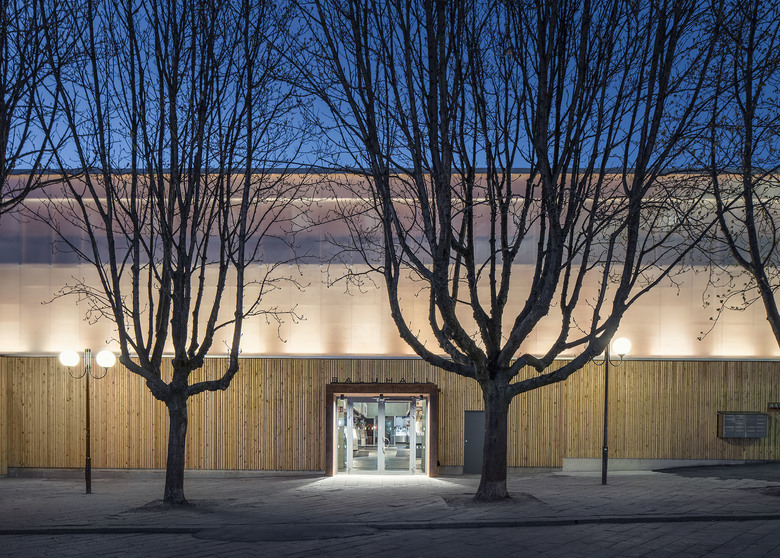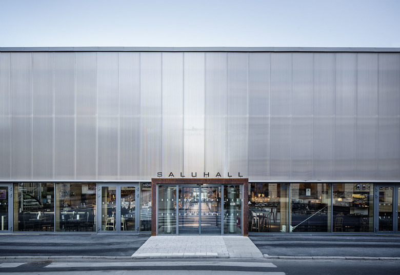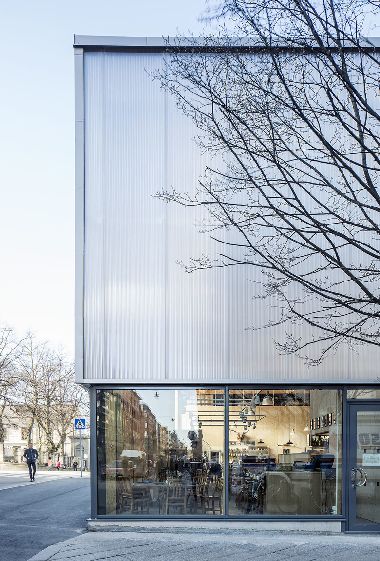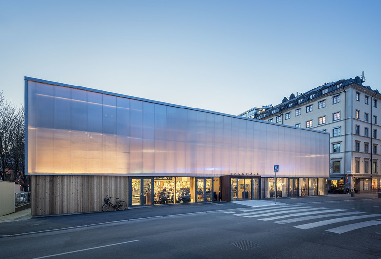 Considerable care has been taken to design the temporary Market Hall with a sense of quality befitting the historic Market Hall while using light weight, cost efficient and sustainable materials befitting the temporary nature of the building. The goal has been to create an attractive temporary addition to the heart of Östermalm that has a positive effect on its surroundings day and night. Full of activity and life during opening hours and a warm shining beacon when the facades translucent polycarbonate sheeting is lit up at night.
