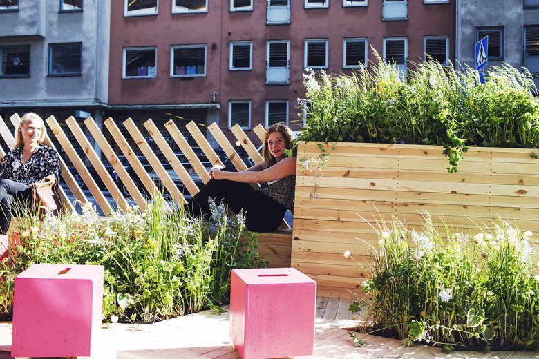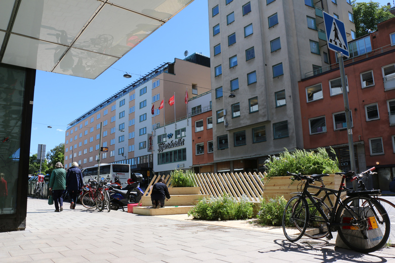 Both passers-by and workers from surrounding buildings heavily used the parklet on Katarinavägen. Climate-smart micro parks combine sustainable storm water management, the creation of public space, and high biodiversity. Even small pilot projects can reduce flooding, act as impromptu meeting places along our streets, and add ecosystem services to our cities. Green retrofits increase social-ecological resilience, and cities stand to gain financially as a result.