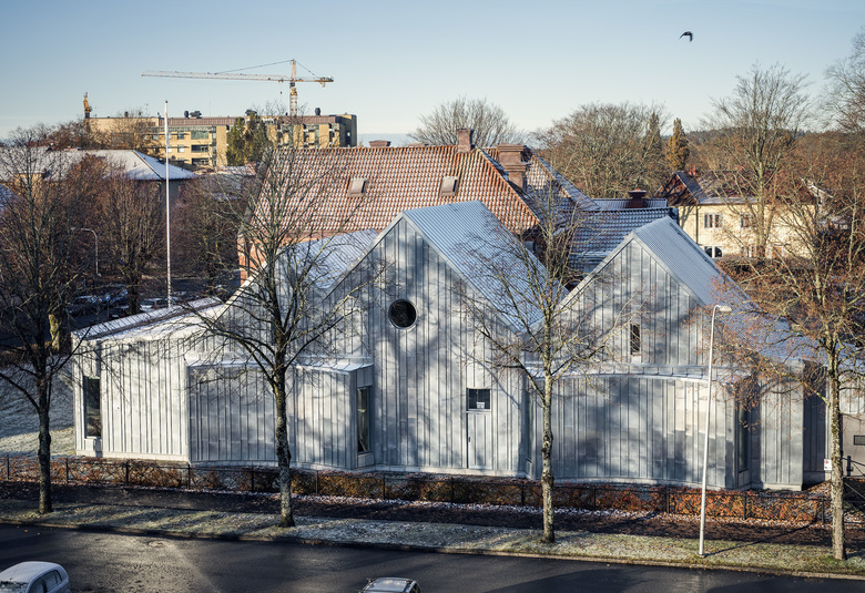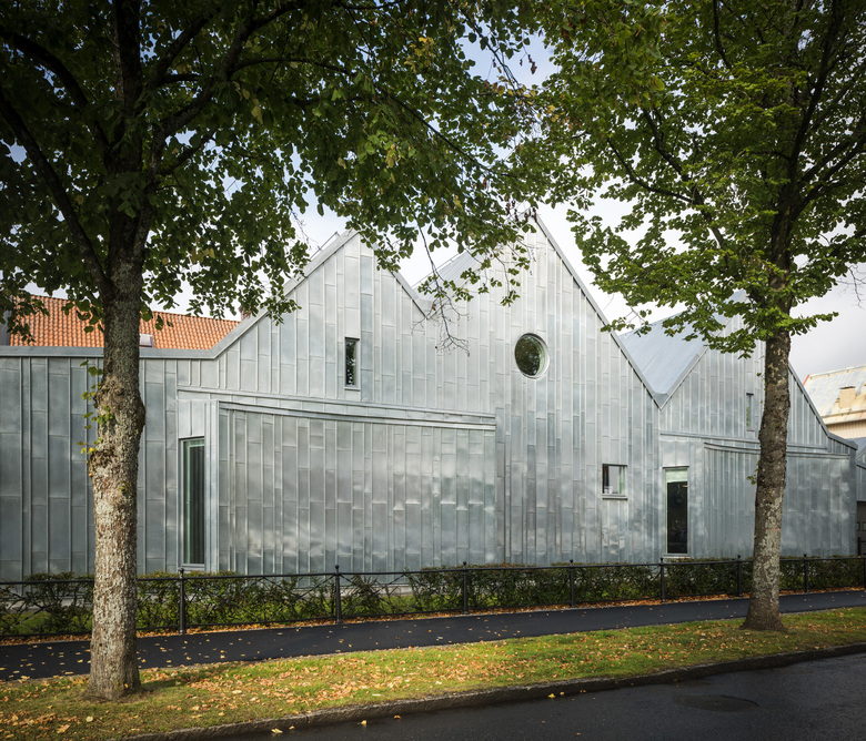 “It was a shape that gave us both flat and steep roofs and we needed a material that could handle this, which led us to zinc as the roofing material. The old building is a solid thick-walled construction but the extension has thinner curtain walls. In this case, zinc sheeting worked well as exterior cladding. We could wrap up the building in a single material and it was obvious what was new and what was old,” says architect Fritz Olausson.