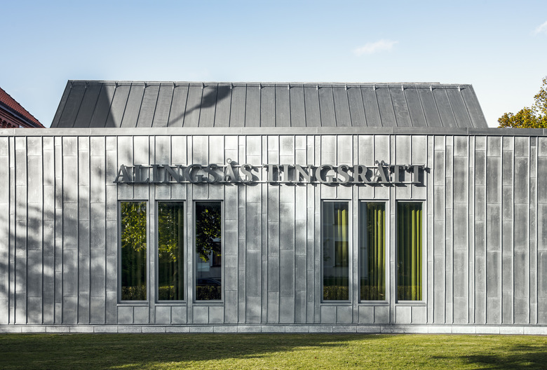 The result, a monolith in zinc, cannot be ignored. The sheeting accentuates the building’s shape and shows its own annual ring at the same time as it ages with dignity—much like a grey and wise judge.