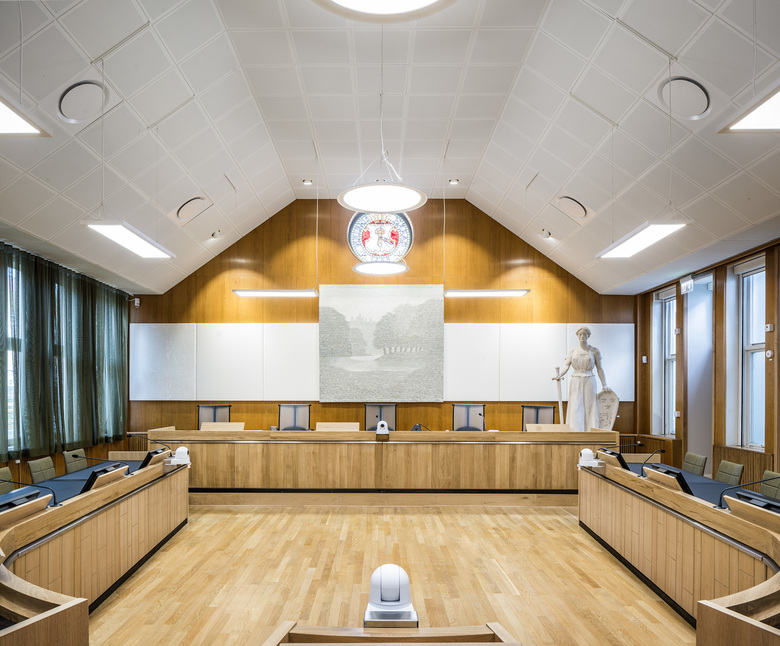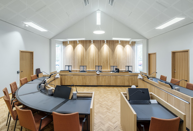 The generous ceiling height made even higher demands on the technical installation, which influenced the furniture. The courtrooms have a lovely sense of space which must be reinforced, not supressed, by the furniture required. One solution to this, among others, is office chairs with semi-transparent backs which make the back wall behind the Court’s bench visible. The wooden frontals of the furniture have references to the facades in brick and zinc. Another unusual detail in the context of courtrooms is that they have direct daylight. If hearings are in camera then curtains can be drawn across the windows.