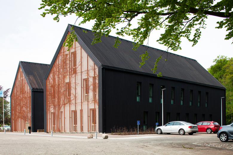 A monochromatic black wooden skin harks back to the Swedish farm tradition. The black interacts with the green setting and the south-western roof’s integrated PV solar panels, and highlights the lighter stonework of the barn building. Contrast comes from the gables’ rust-coloured corten screen that interacts with the barn’s warm, red brick features. The perforated metal functions as a passive sun screen. Oak trees on site provided the inspiration for a graphic design feature – an abstract reflection of the green setting.