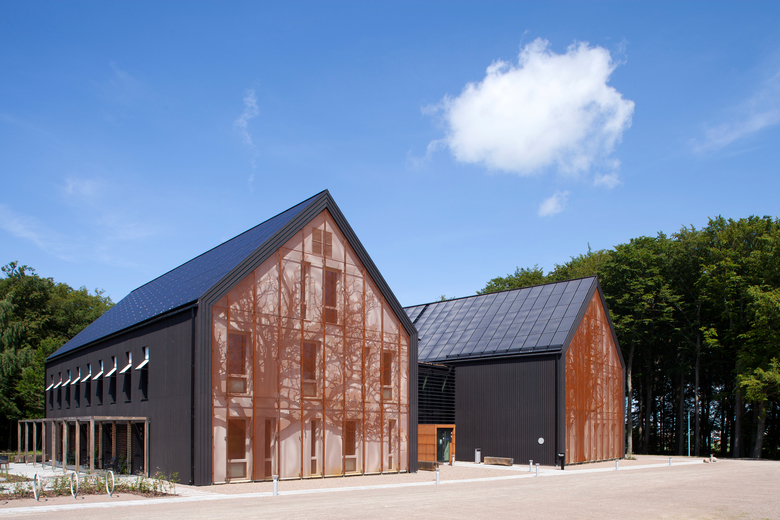 The new buildings have a unified approach and are inspired by the barn’s geometric form. The buildings echo the barn’s roof angle and ridge height but with an independent identity.