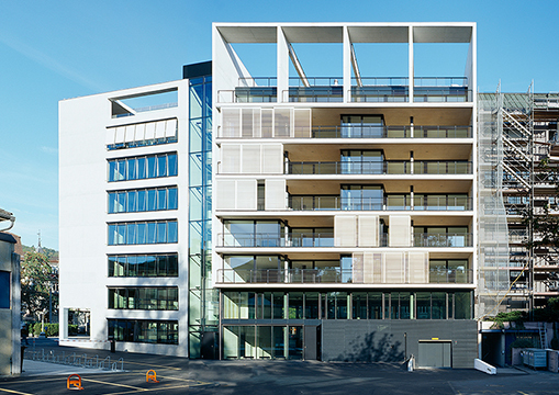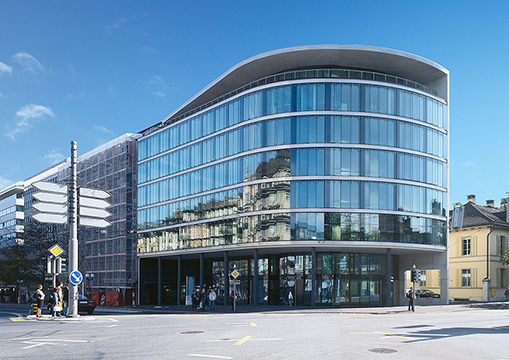 Prominent urban development on Pilatusplatz in the city of Lucerne. Commercial and office use along the street edges, with a residential wing containing high-end apartments inserted in an internal courtyard.