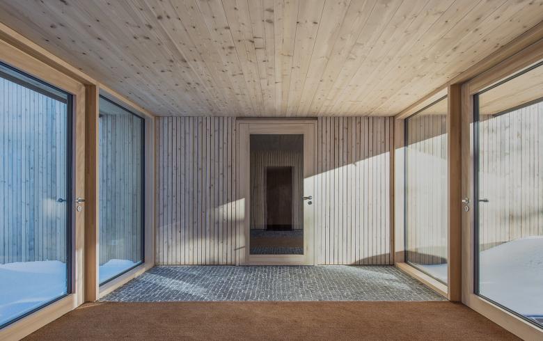 Ein hoher Vorfertigungsgrad der Holzkonstruktion ermöglichte eine verkürzte Bauzeit, um extremen Witterungsbedingungen zu begegnen und gleichzeitig einen Rückbau nach Ende der Nutzung zu erleichtern. Neben Wänden, Decken und Innenausbauten besteht auch die Fassade aus Wießtanne und fügt sich dadurch ins Landschaftsbild ein.