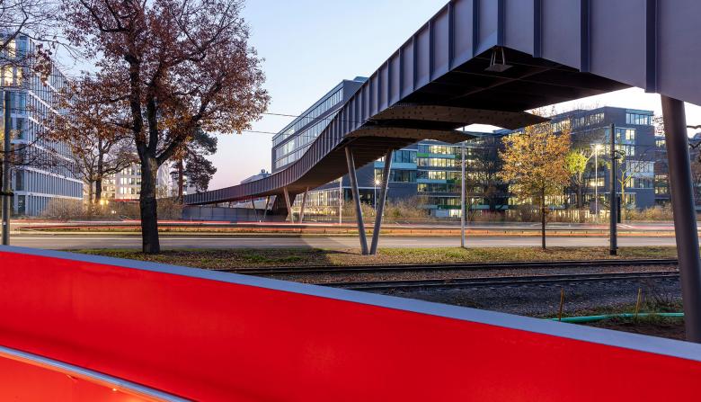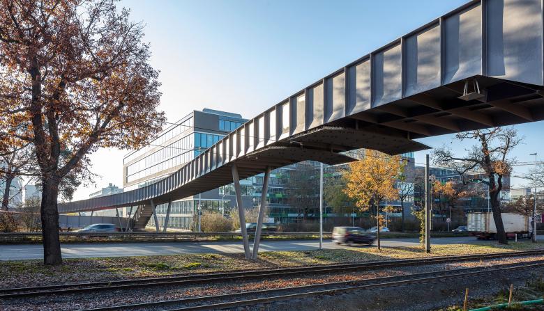 Die Fuß- und Radwegebrücke über die stark befahrene Rheinstraße in Darmstadt stellt die fuß- und radläufige Verbindung zwischen dem Hauptbahnhof und dem Technologiezentrum (TZ) Rhein-Main her. Die Gestalt der Brücke entwickelt sich aus einer Trogkonstruktion, die auf V-förmigen Doppelstützen aufliegt. Sie schwingt elegant über die Rheinstraße und schlängelt sich spielerisch mit ihren langen Rampen durch den Baumbestand. Die Steigung der beiden Rampen ist für die Nutzung durch Radfahrer wie auch für Rollstuhlfahrer ausgelegt; Fußgänger können zudem die an den Brückenenden angeordneten Treppen nutzen.