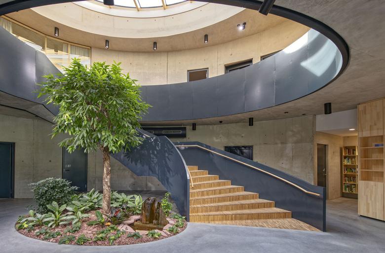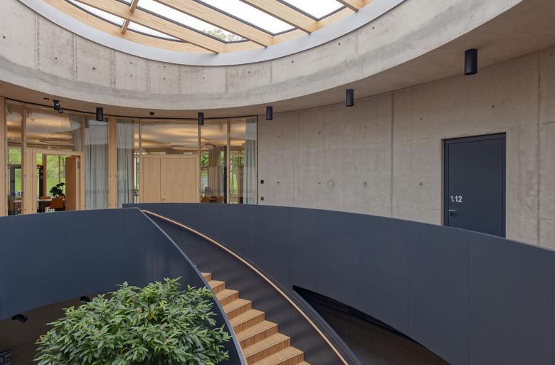 Das klima- und ressourcenschonende Leuchtturmprojekt zeichnet sich zusätzlich durch einen, hinsichtlich des CO2-Äquivalents, optimierten Zement (CEM III), durch eine verbesserte Dämmung der Gebäudehülle, durch einen Eisspeicher für Heiz- und Kühlzwecke, den konsequenten Einsatz von Photovoltaik zur Realisierung eines bilanziellen Nullenergiehaus-Konzepts aus.