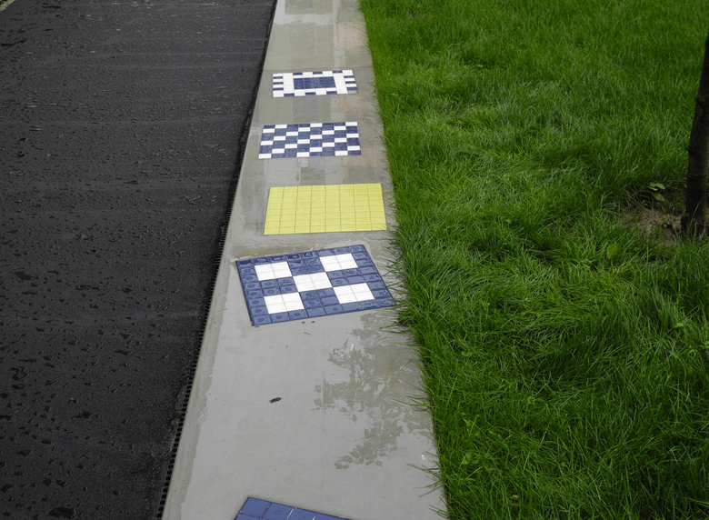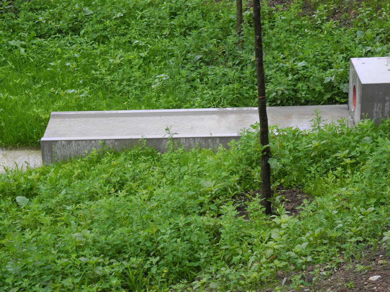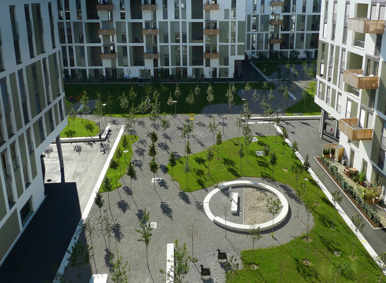 Als stilisiertes Kleeblatt liegt das Gebäude in der fast quadratischen Parzelle. Es bildet einen grossen Innenhof mit einem Hain aus 318 kleinkronigen, von einer umlaufenden Sitzmauer gerahmten Hochstämmen. Die urbane, parkartige Stimmung stellt sich dem vorstädtischen Siedlungsgrün des übrigen Quartiers entgegen. Grosskronige Schwarzerlen, Silberweiden und Säulenpappeln prägen die drei zu den öffentlichen Strassen orientierten aussen liegenden Grünräume. Der Burggraben, ein an Rieselfelder mittelalterlicher Städte anklingendes, mit Schwertlilien und Gräsern bepflanztes Entwässerungssystem, geländemodellierende Retentionsmulden und unterirdische Versickerungsanlagen führen sämtliches Regenwasser, ohne Belastung von Kanalisation und Kläranlage, direkt dem Grundstück zu. Die Wohnüberbauung Klee ist so gesehen auch eine autark arbeitende ’Entwässerungsmaschine’.