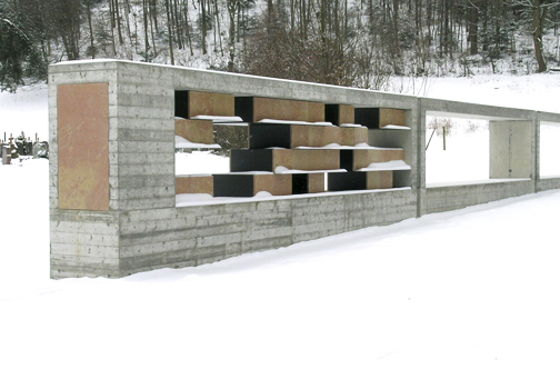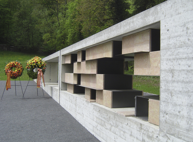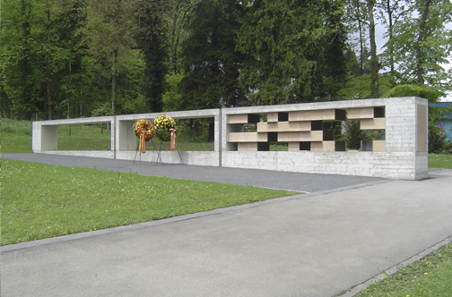 Lärmbelastet aber landschaftlich idyllisch liegt der Friedhof Zil zwischen bewaldetem Abhang und Baumhecken und erinnert in seinem Charakter an einen nordischen Waldfriedhof. An seinem äussersten Ende steht die neue Urnenwand vor einer imposanten Gehölzkulisse. Als Bild und Bilderrahmen zeigt sie in den Öffnungen zwischen den gelblich bis aschgrauen Grabplatten aus Laufener Kalkstein und der dunkelgrauen Stahlkonstruktion verschiedene Aspekte der Waldvegetation. Natur wird erkennbar und erscheint als Landschaft in unterschiedlichen Ausschnitten. Die hier Bestatteten existieren nicht, sie sind den Hinterbliebenen aus ihrem Leben davongelaufen. Es bleiben nur Erinnerungsausschnitte an sie. Trauern heisst, am Bild eines Verstorbenen zu arbeiten.