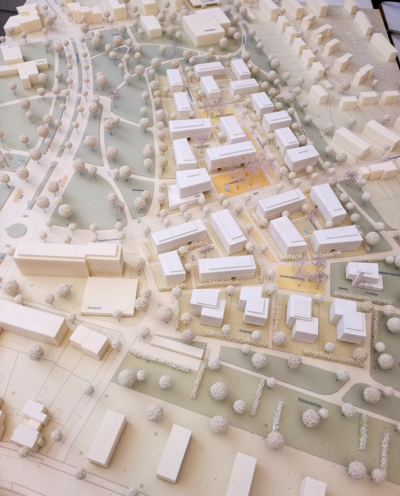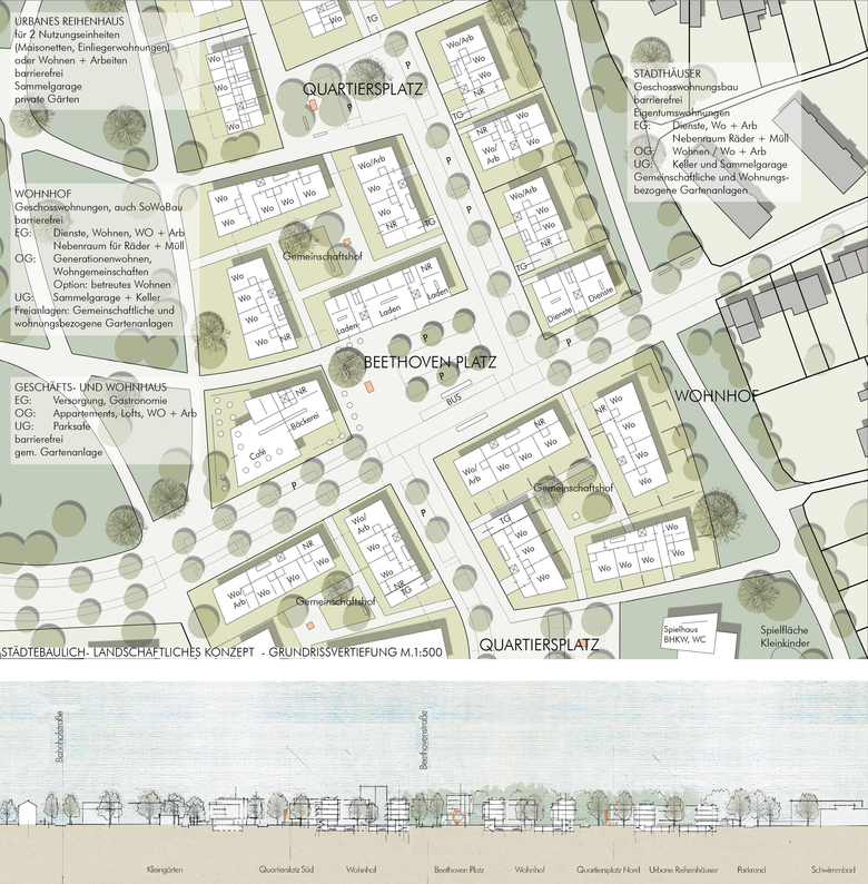 Das neue Beethovenquartier, ein von bestehenden Park- und Grünanlagen eingerahmtes „Urbanes Gartenstadtquartier“, hebt sich mit spezifischer Raum- und Baustruktur deutlich von seinem weitgehend heterogenen Umfeld ab. Das elastisch konzipierte Quartiersgefüge erlaubt aufgrund einer offenen, jedoch raumbildenden Bauweise ein hohes Maß an Durchgrünung und öffnet sich über Raum- und Blickbezüge zu den umgebenden Parkanlagen und Stadtquartieren.