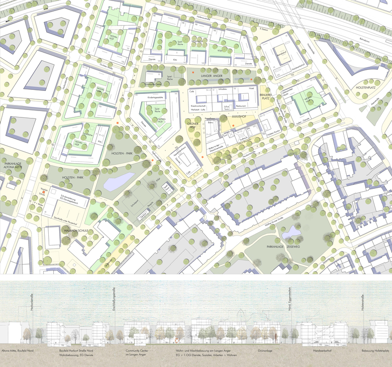 Die neue Quartiersmitte wird von einer Folge spannungsvoll zugeschnittener Platzräume und Höfe im Zusammenspiel mit dem markanten Ost-West-gerichteten Grünraum des „Langen Angers“ geprägt. Er wird zur Nahtstelle von Kernbereich und den ihn einrahmenden, großzügig zugeschnittenen Wohn-Baufeldern, die das Holsten-Quartier mit Ihrer geschlossenen, kräftigen Randbebauung zu den Lärmquellen von Bahn und Straßen abschirmen.