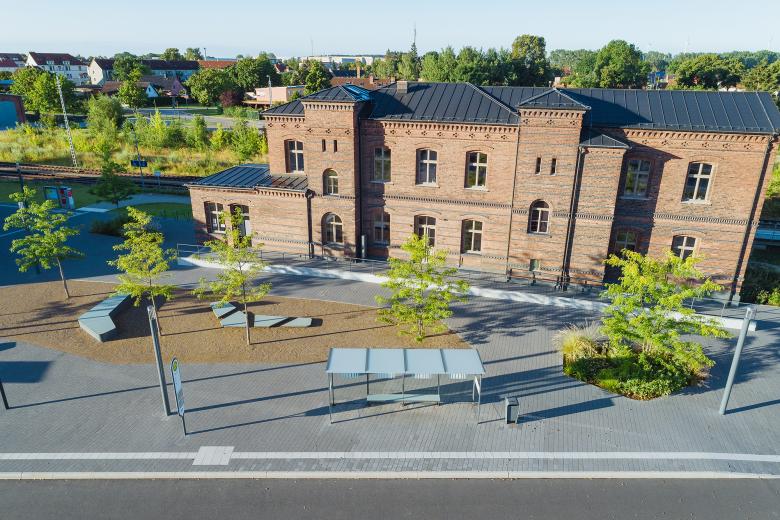 Im Rahmen der Landesgartenschau 2019 plant die Stadt Wittstock/Dosse eine umfassende Neuordnung und Umgestaltung des Bahnhofareals. Die leerstehenden Bahnhofsgebäude werden saniert und zukünftig für Verwaltung und Gesundheitsversorgung genutzt. Unser Entwurf schafft einen repräsentativen Bahnhofsvorplatz mit neuen Aufenthaltsqualitäten. Der fahrende und ruhende Verkehr im Bahnhofsumfeld wird neu geordnet; die angrenzenden Zufahrtsstraßen umgebaut und saniert. Die neuen Freiflächen geben den sanierten Gebäuden des Bahnhofsareals einen würdigen Rahmen und machen sie als einheitliches Ensemble erlebbar. In freier Form gestaltete Bodenbeläge prägen einen Platzbereich, der Flächen für die saisonal aufgestellten Tische und Stühle des Kiosks bereitstellt. Zusätzlich wird eine Spiel- und Aufenthaltsfläche mit großzügigen Sitzgelegenheiten angelegt. Locker eingestreute Bäume bilden ein schattenspendendes Blätterdach. Unsere Planung berücksichtigt die vielfältigen Anforderungen der unterschiedlichen Nutzergruppen und schafft einen hochwertigen Freiraum, der einerseits als zentraler Anlaufpunkt für die Reisenden und Pendler dient, andererseits einen grünen Platz mit hoher Aufenthaltsqualität für die Besucher und Kunden der Praxen und der Verwaltung schafft.
