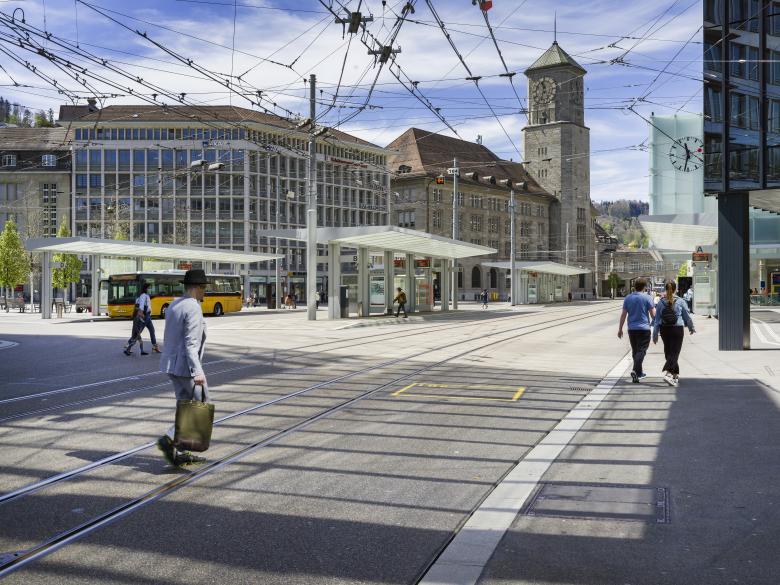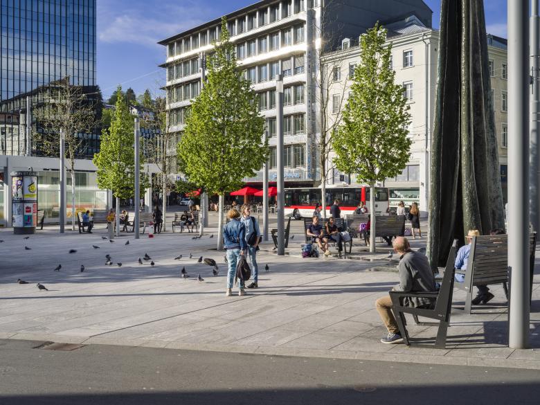 Aufgrund der neuen, kompakten Organisation des öffentlichen Verkehrs konnten wir grosszügige Platzräume mit unterschiedlichen Aufenthaltsqualitäten schaffen. Der Kornhausplatz lädt als grosszügiger Stadtplatz und zentraler Begegnungsort mit Natursteinbelag, Lämmlerbrunnen sowie Sitzbänken und Restaurants zum Verweilen unter den neu gepflanzten Bäumen ein. Gleichzeitig bleibt ausreichend Platz für temporäre Events. Die direkt auf das historische Aufnahmegebäude hin führende Gutenbergstrasse wurde zur Fussgängerzone umgebaut. Das mit Stauden und Kirschbäumen gefasste Bahnhofpärkli im Osten bildet inmitten der Verkehrsflächen eine grüne Oase und ist Ausgangspunkt für die Allee entlang der Poststrasse, die Fussgänger und öffentlichen Verkehr am blühenden Grabenpärkli vorbei in die Innenstadt führt. Am nördlichen Ende der neuen Personenunterführung-Ost entstanden zwei kleine Plätze zum Verweilen und als Entrées zum Bahnhof. Die Neuorganisation des Bahnhofs St.Gallen wurde mit dem Schweizerischen Mobilitätspreis FLUX 2019 ausgezeichnet.