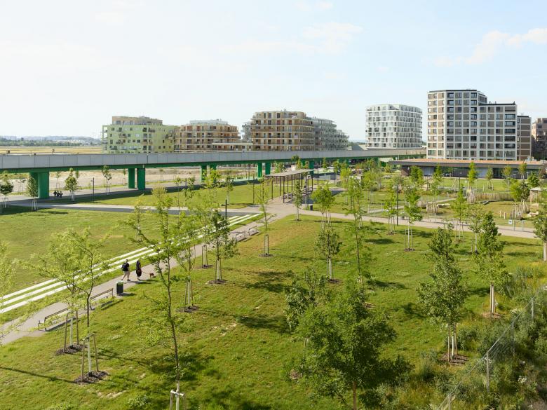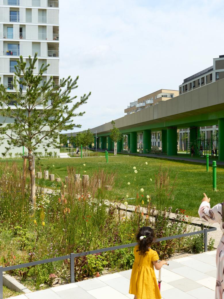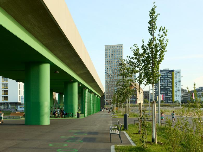 In der wachsenden Seestadt Aspern bei Wien entsteht der Elinor-Ostrom-Park, der von einem durchgängigen, lockeren Baumrahmen eingefasst wird. Dort wo die angrenzenden Wohnlagen direkt an die Hochbahn grenzen, werden im alternierenden Rhythmus lockere Reihen aus säulenförmigen Bäumen angeordnet. Der heterogene Baumrahmen definiert eine offene Parklichtung, die den Blick auf die umgebenden Stadträume und die Hochbahn freigibt. Die Offenheit der Lichtung steht im spannungsvollen Kontrast zur Dichte des Parkrandes. Im Zentrum der südlichen Lichtung ist ein Parkbalkon verankert, von dem aus die Blicke über die Parklichtung hinweg bis zum nahen See schweifen. Der am Ufer liegende Seebogenplatz bildet den Übergang zur Seepromenade.
