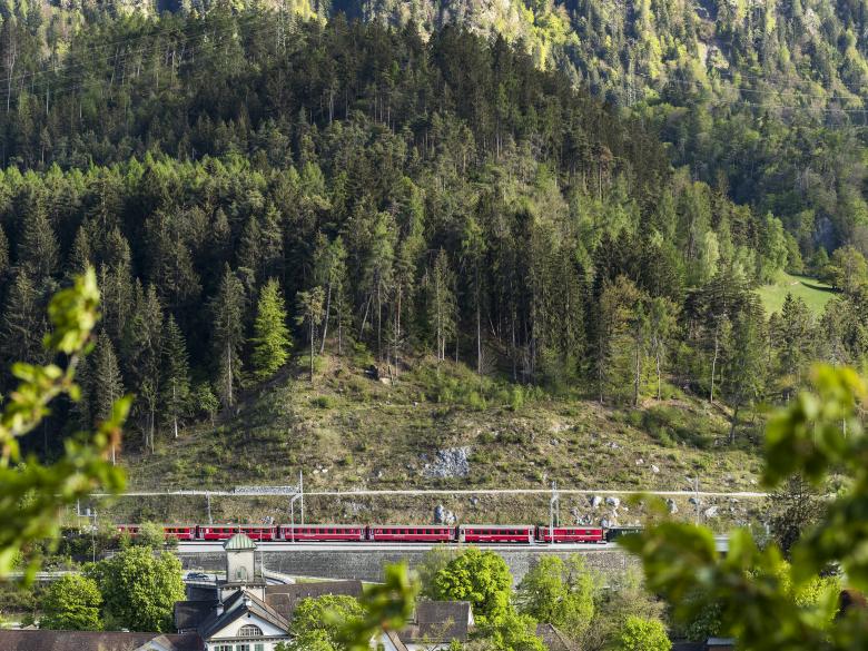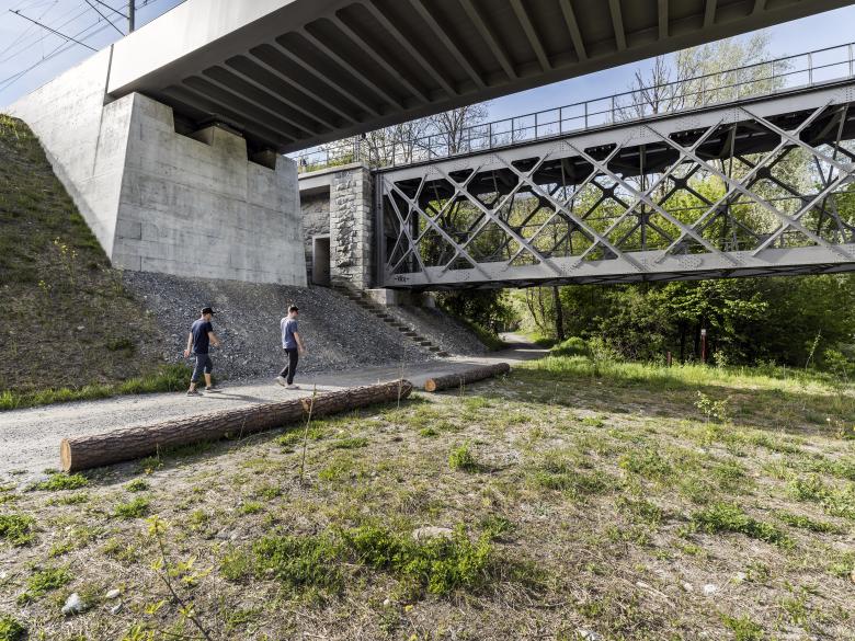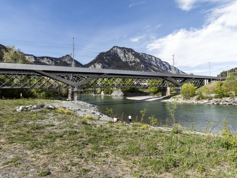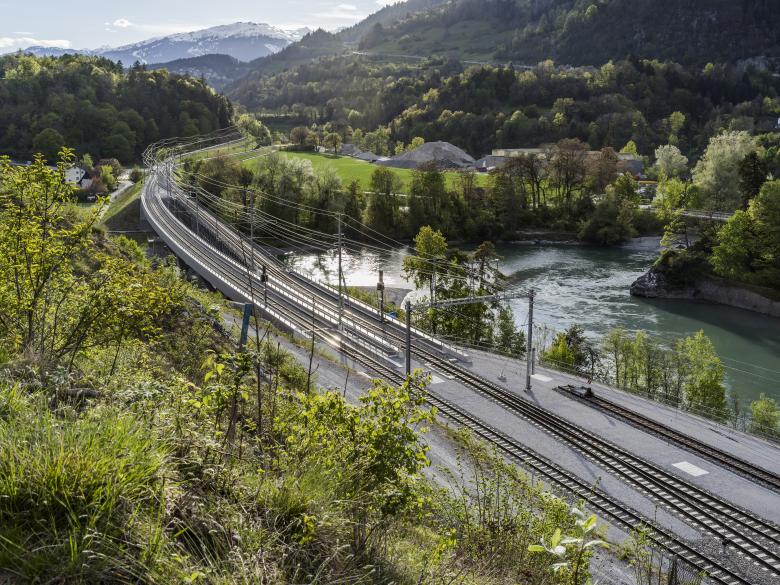 Wo Vorder- und Hinterrhein zusammenfliessen, ergänzt die zweite Hinterrheinbrücke die bestehende, denkmalgeschützte Fachwerkbrücke als zweite Gleisspur der bekannten Bahnstrecke zwischen Chur und Ilanz oder St.Moritz. Eigenartige Hügel prägen hier die Landschaft: Die «Toma», kegelförmige, aus Bergsturzmaterial entstandene Geländeformen. Um eine weniger auffällige landschaftliche Einbettung der Bahnanlagen zu erreichen, wurden rund 30'000 m3 Hang und eine acht Meter hohe Stützmauer abgebaut und durch eine fein strukturierte, naturnah geformte Böschung ersetzt. Durch den ordnenden Eingriff werden die Infrastrukturanlagen räumlich begrenzt. Der grüne und bewaldete Hintergrund bringt die Brücken besser zur Geltung. So fügt sich «Sora giuvna», die jüngere Schwester der historischen Hinterrheinbrücke, elegant und landschaftsverträglich in das einmalige Umfeld ein und findet ihren Platz in der Familie bedeutender Brücken der Region.