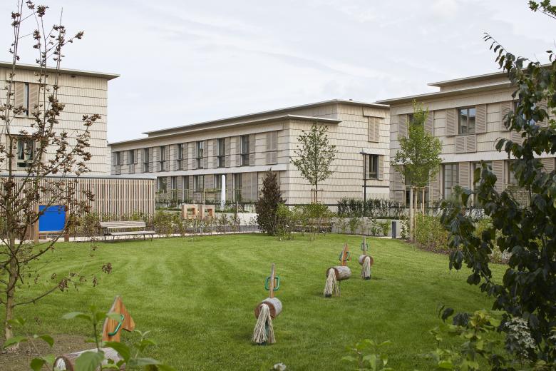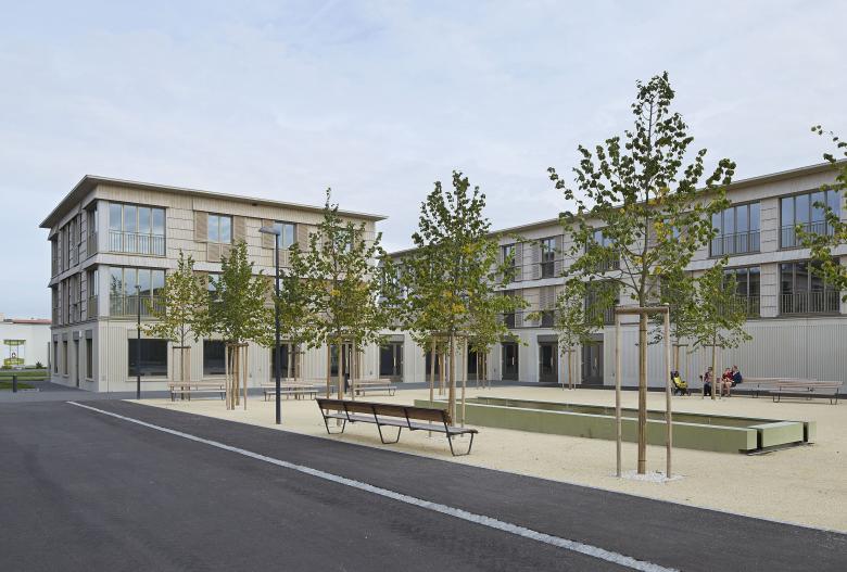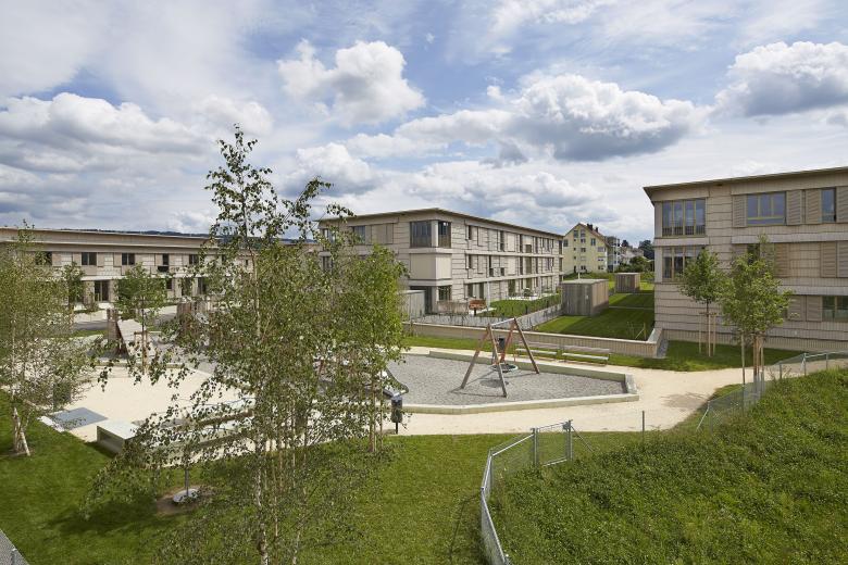 90 Eichen als Sinnbild für Ökologie und Dauerhaftigkeit und rund 80 weitere vorwiegend einheimische Bäume prägen den Freiraum der zum Zeitpunkt der Erstellung grössten Schweizer Minergie P-Eco-Siedlung. Unterschiedlichste Aufenthaltsbereiche fördern den Austausch der Generationen und Kulturen und leisten einen wesentlichen Beitrag für das Gemeinschaftsleben in der Siedlung. Drei Pocket-Parks mit verschiedenen Spiel- und Sporteinrichtungen werden geprägt durch raumbildende Hecken und blühende Grosssträucher. Der Quartierplatz aus wasserdurchlässigem Belag wird mit seinem grosszügigen Wasserbecken und den Eichen zum wichtigen Treffpunkt und Veranstaltungsort im Quartier. Eine grosse Spiellandschaft aus Holz mit diversen Spielmöglichkeiten ist Anziehungspunkt für die Kinder und deren Familien. Die minimal dimensionierten Erschliessungswege sind als Begegnungszone ausgewiesen. Das Regenwasser wird zu einem Grossteil vor Ort versickert.