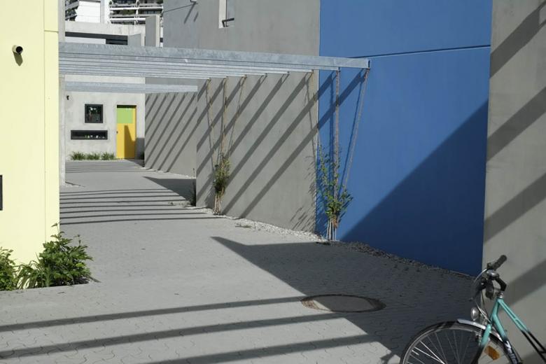 Markante Elemente des Freiraums wie die Pflanzringe, die Pflanzstreifen entlang der Gebäudezeilen, die Mauerscheiben am südlichen Abschluss der Gassen sowie die Materialität der Beläge werden wieder aufgegriffen und durch einzelne, gezielt gesetzte Elemente wie die Gleditsien-Baumgruppen ergänzt.